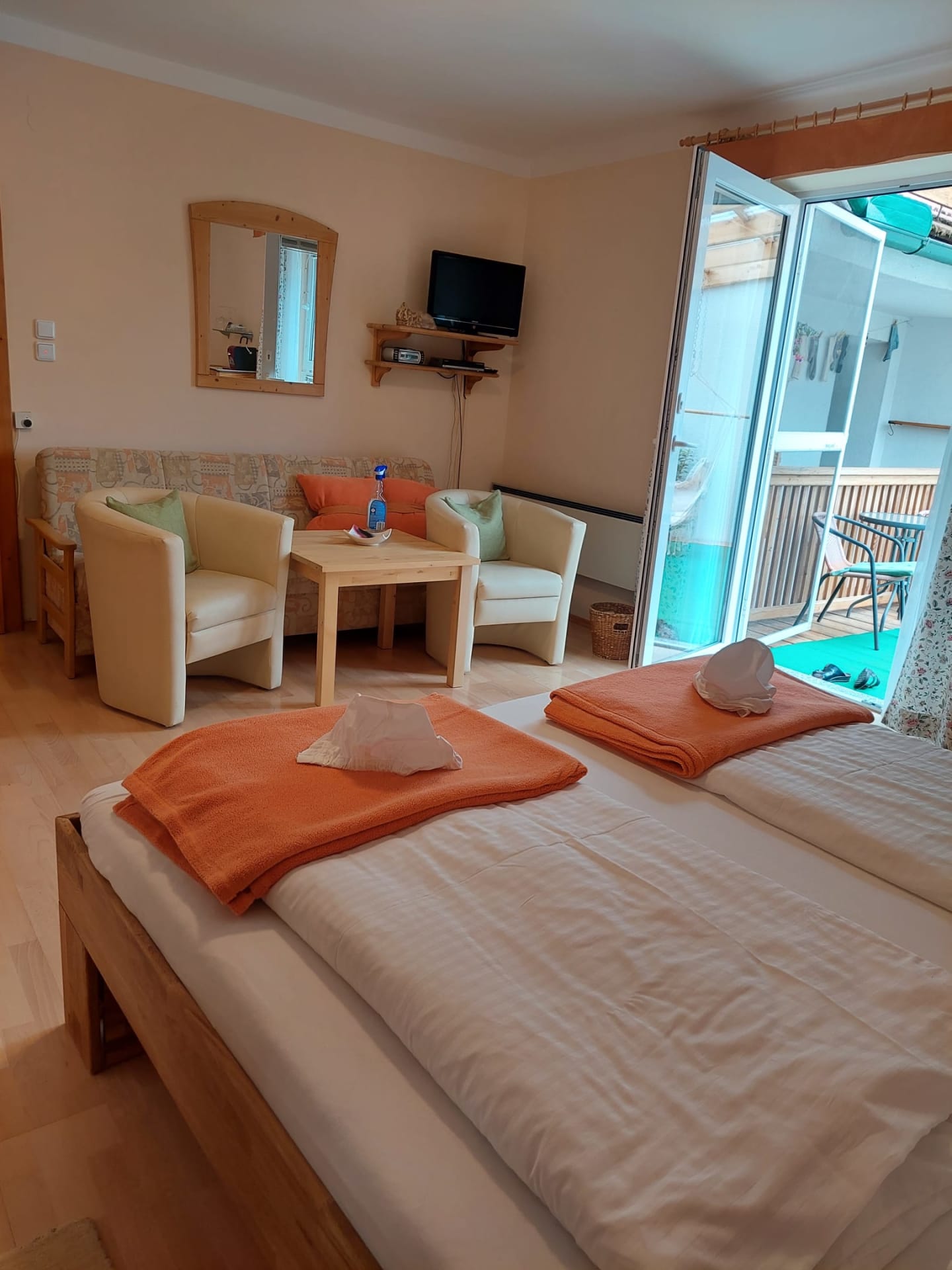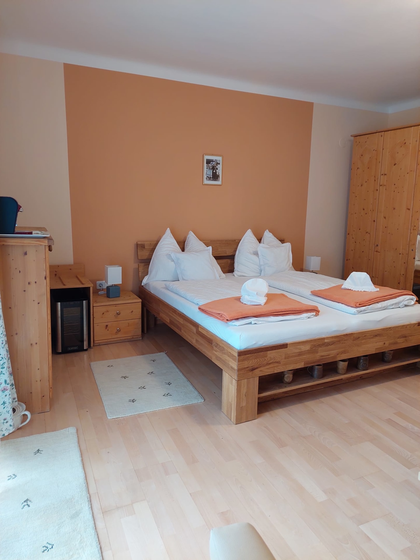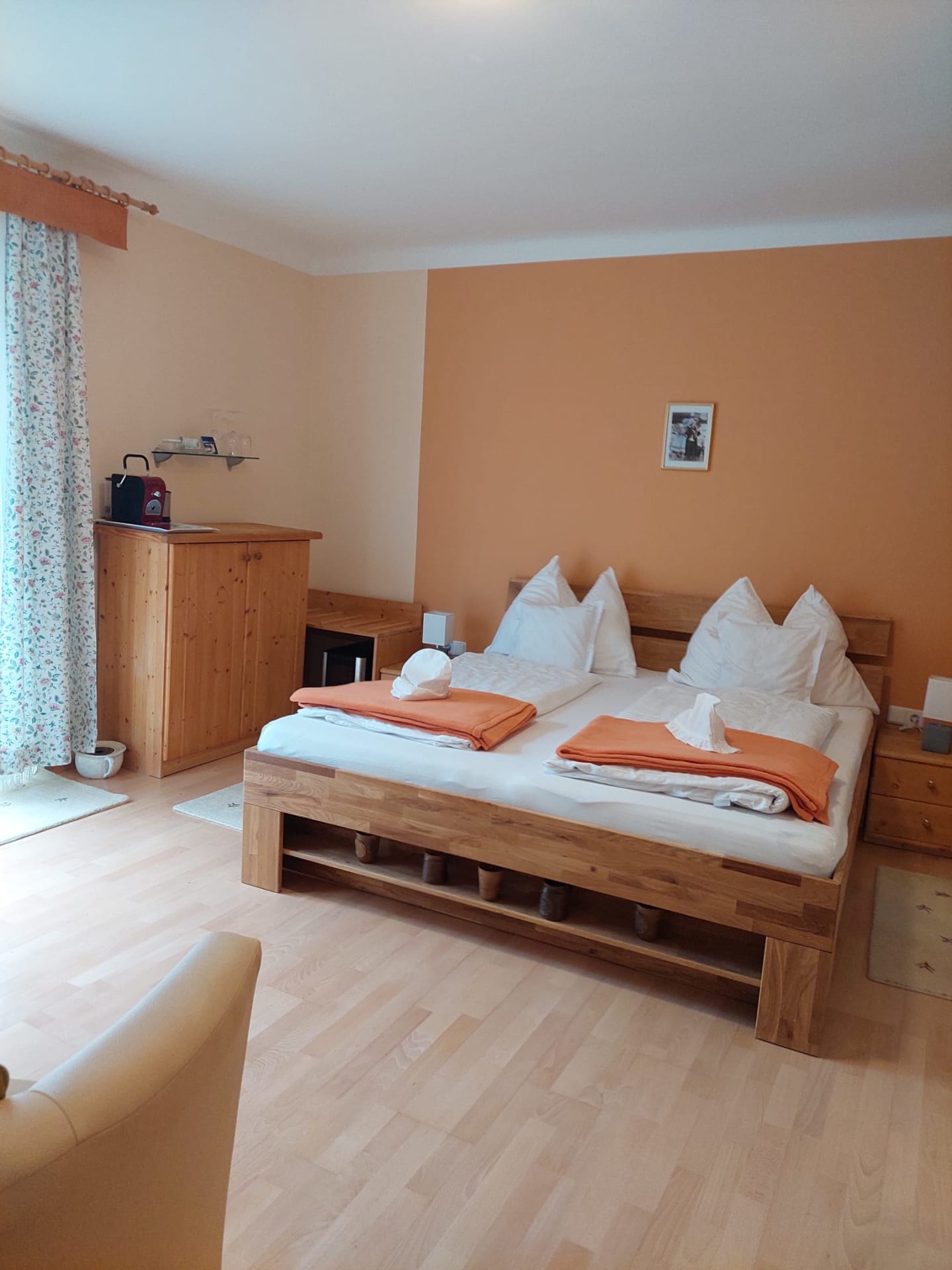Doppelzimmer mit Dusche und WC, große Terrasse mit Blick in die Natur. Sat TV , Radiowecker, Kühlschrank, Safe, Kaffeeautomat usw. Dieses Zimmer liegt zum ruhigen Innenhof, erleben Sie die Natur hautnah und lassen Sie sich von Vogelgezwitscher und Sonnenstrahlen, anstatt von Autolärm wecken.
