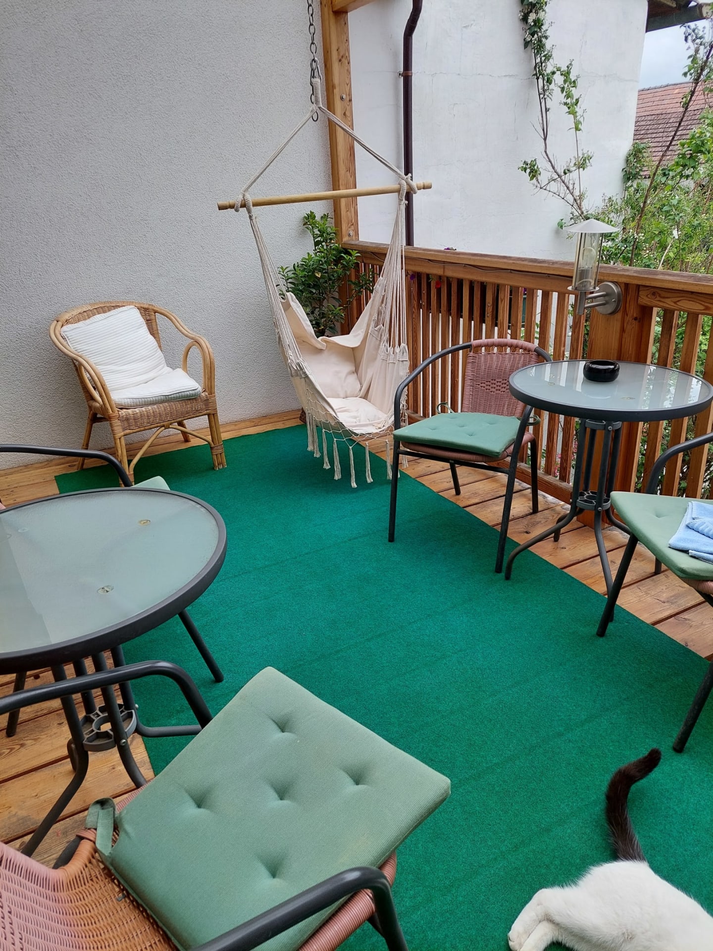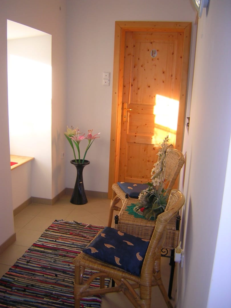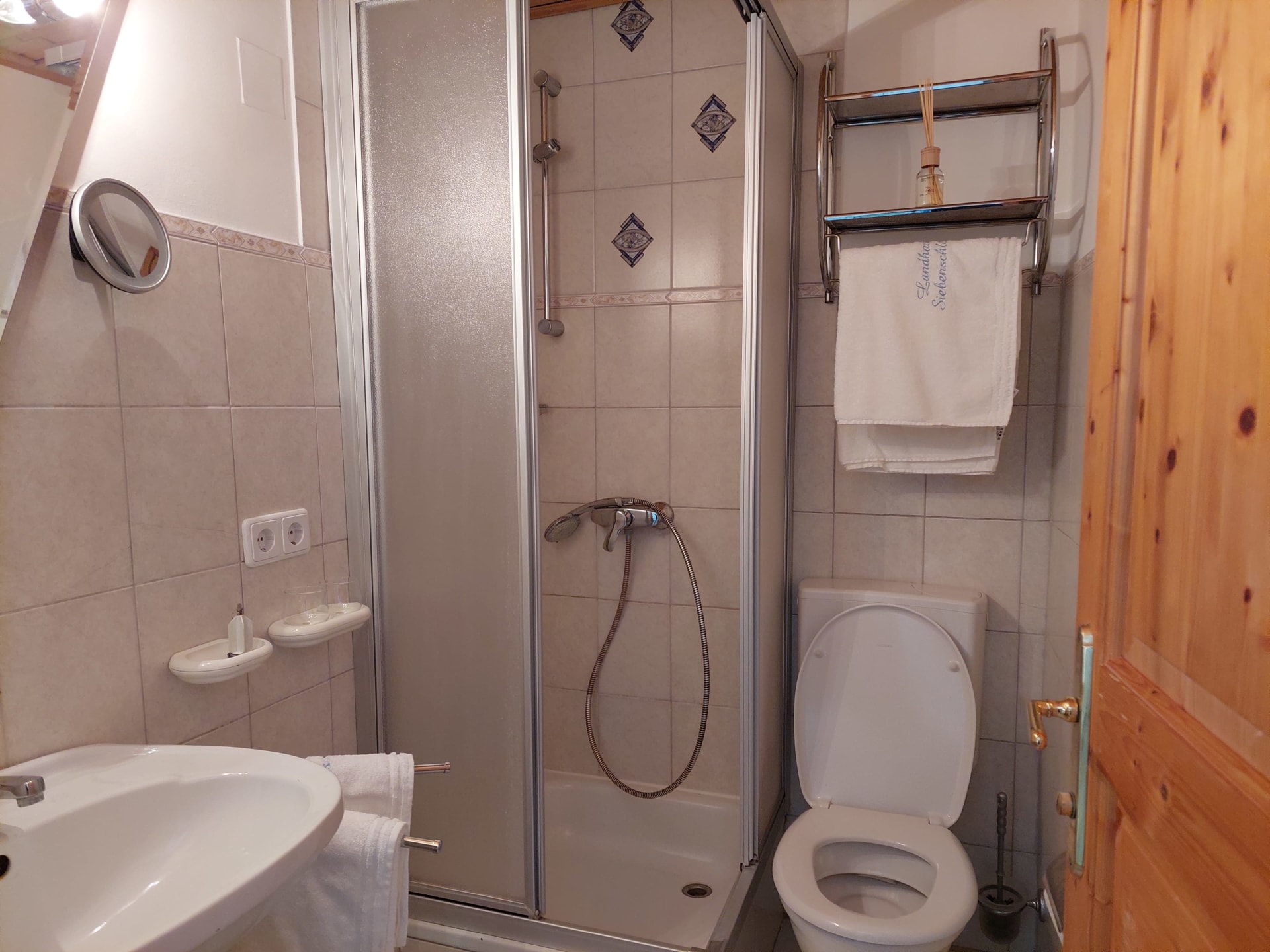 Doppelzimmer mit Dusche und WC, große Terrasse mit Blick in die Natur. Sat TV , Radiowecker, Kühlschrank, Safe, Kaffeeautomat usw. Dieses Zimmer liegt zum ruhigen Innenhof, erleben Sie die Natur hautnah und lassen Sie sich von Vogelgezwitscher und Sonnenstrahlen, anstatt von Autolärm wecken.