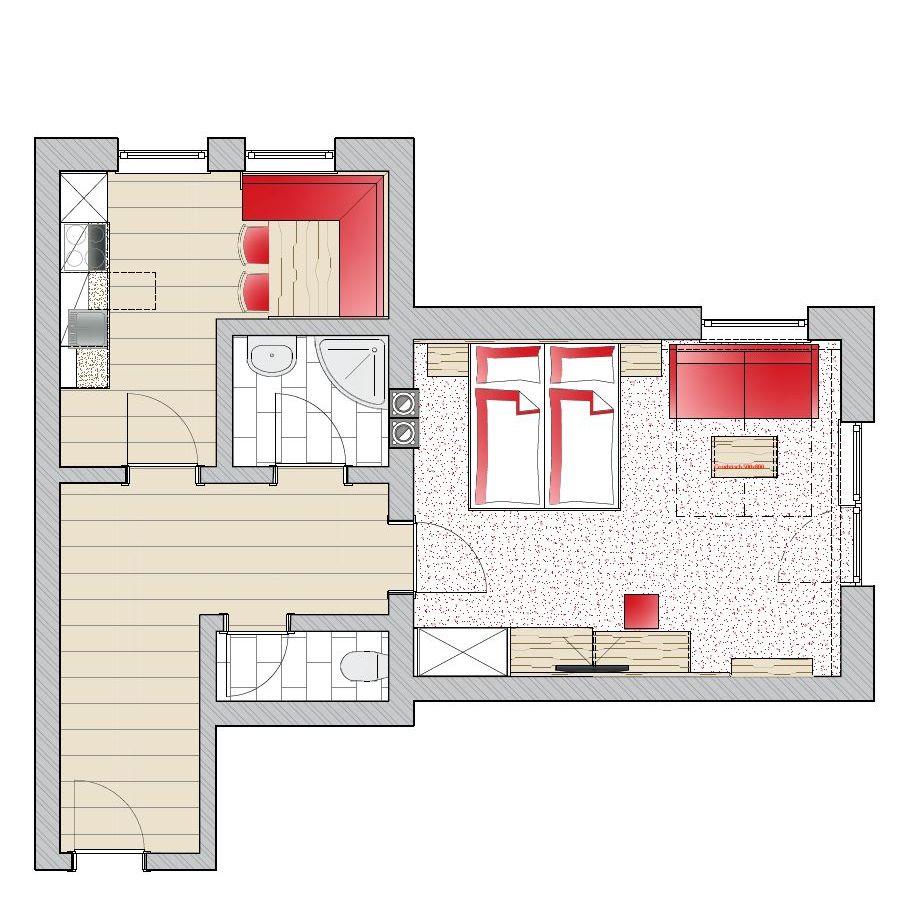 APPARTEMENT II Unser neu errichtetes Appartement Piccolo besteht aus: 1 Doppelzimmer mit TV und einem Sofa (Schlafsofa für 2 weitere Personen); voll ausgestattete Küche mit Essbereich, Geschirrspüler, Kaffeemaschine, Cerankochfeld, Kühlschrank uvm.; 1 Badezimmer mit Dusche; separates WC und Vorraum. „Sonnenanbeter“ fühlen sich am Balkon „wie zu Hause“. Größe ca. 42 m².