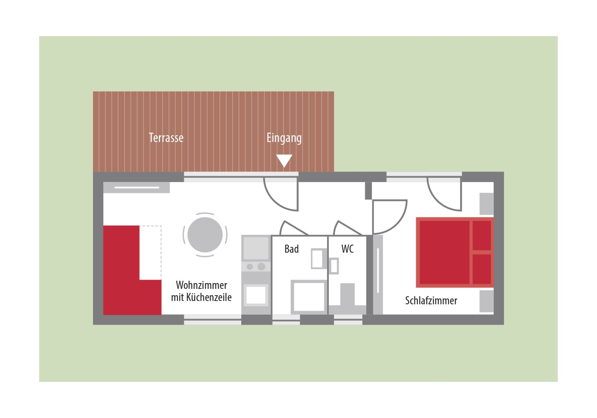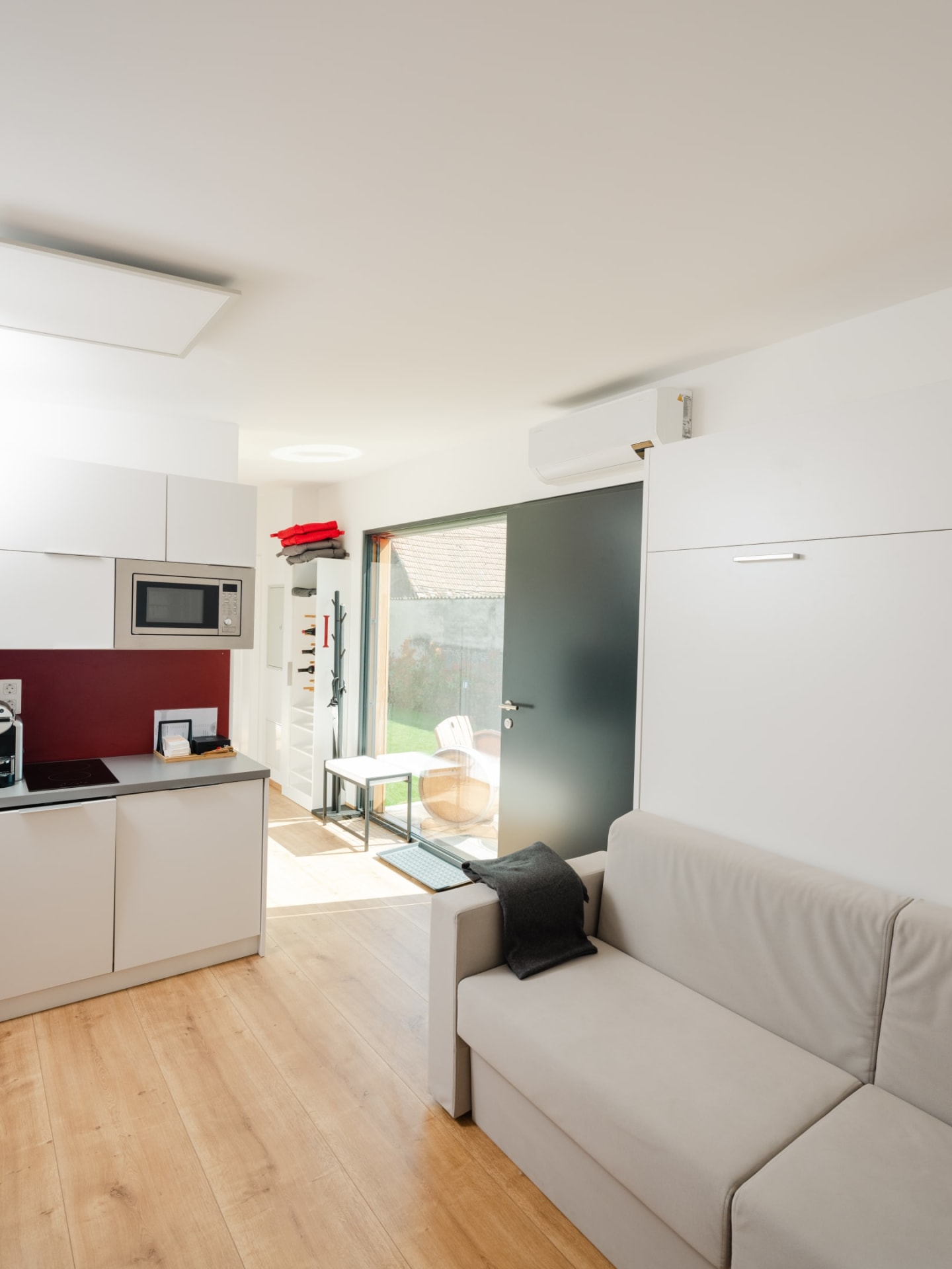 Unser Appartements wurden mit natürlichen Baustoffen errichtet und ermöglichen ein ökologisches Wohnen. Sie haben je 32m² und sind mit einer Küchenzeile, Dusche, WC und einem Wohnzimmer mit Schlafraum für bis zu max. 4 Personen ausgestattet. Jedes Haus verfügt über eine Terasse mit Sitzmöglichkeit.
