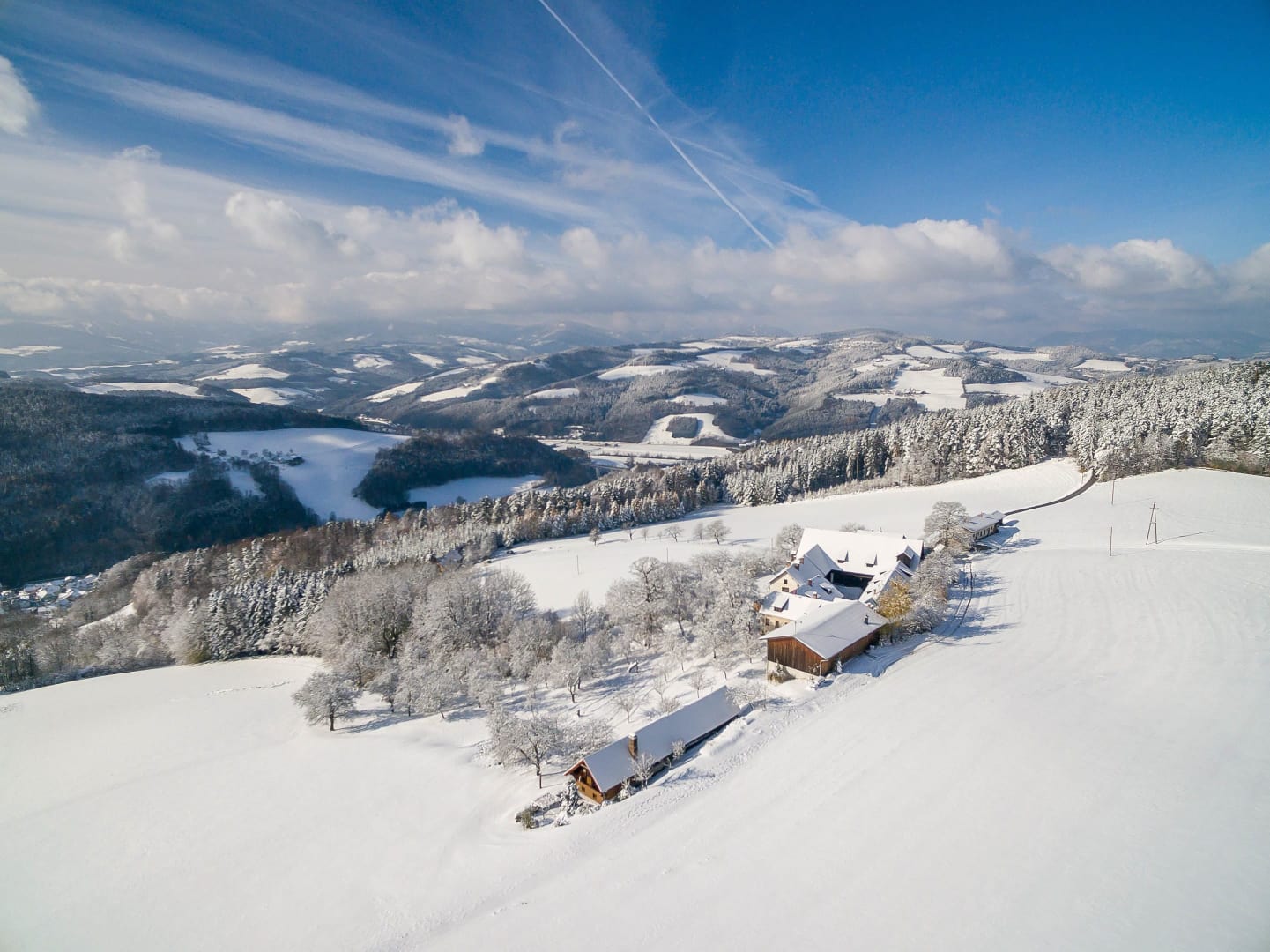 Unser Hof liegt außerhalb des Ortsgebietes, abseits der Hauptverkehrswege auf einem sonnigen Südhang mit Panoramablick auf das Wechselgebiet. Die Ferienwohnungen, -häuser befinden sich nahe dem Wirtschaftsgebäude mit Parkmöglichkeit, Skischuhraum ... und viel Natur, soweit das Auge reicht.