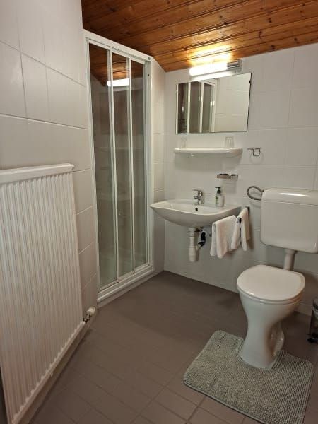 Wir verfügen über 4 DZ oder 2 Familienzimmer (2 getrennte Zimmer mit DU/WC, SAT- TV, Verbindungstür und Vorraum), jedes Zimmer mit DU/WC, SAT-TV und Radio; ein Aufenthaltsraum steht ebenso zur Verfügung wie auch eine Gästeküche, die jederzeit kostenlos benutzt werden kann.