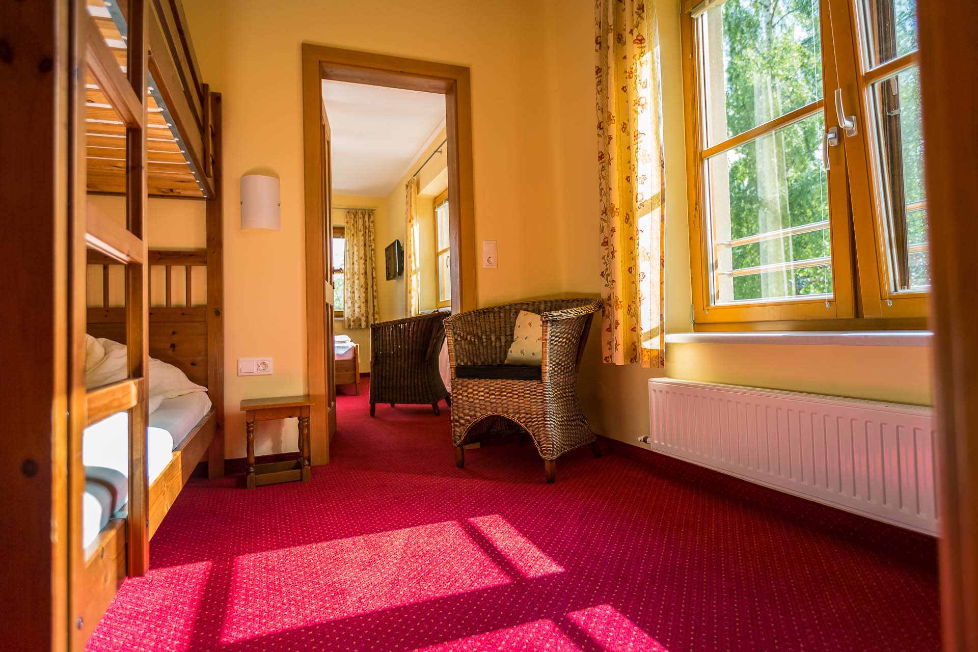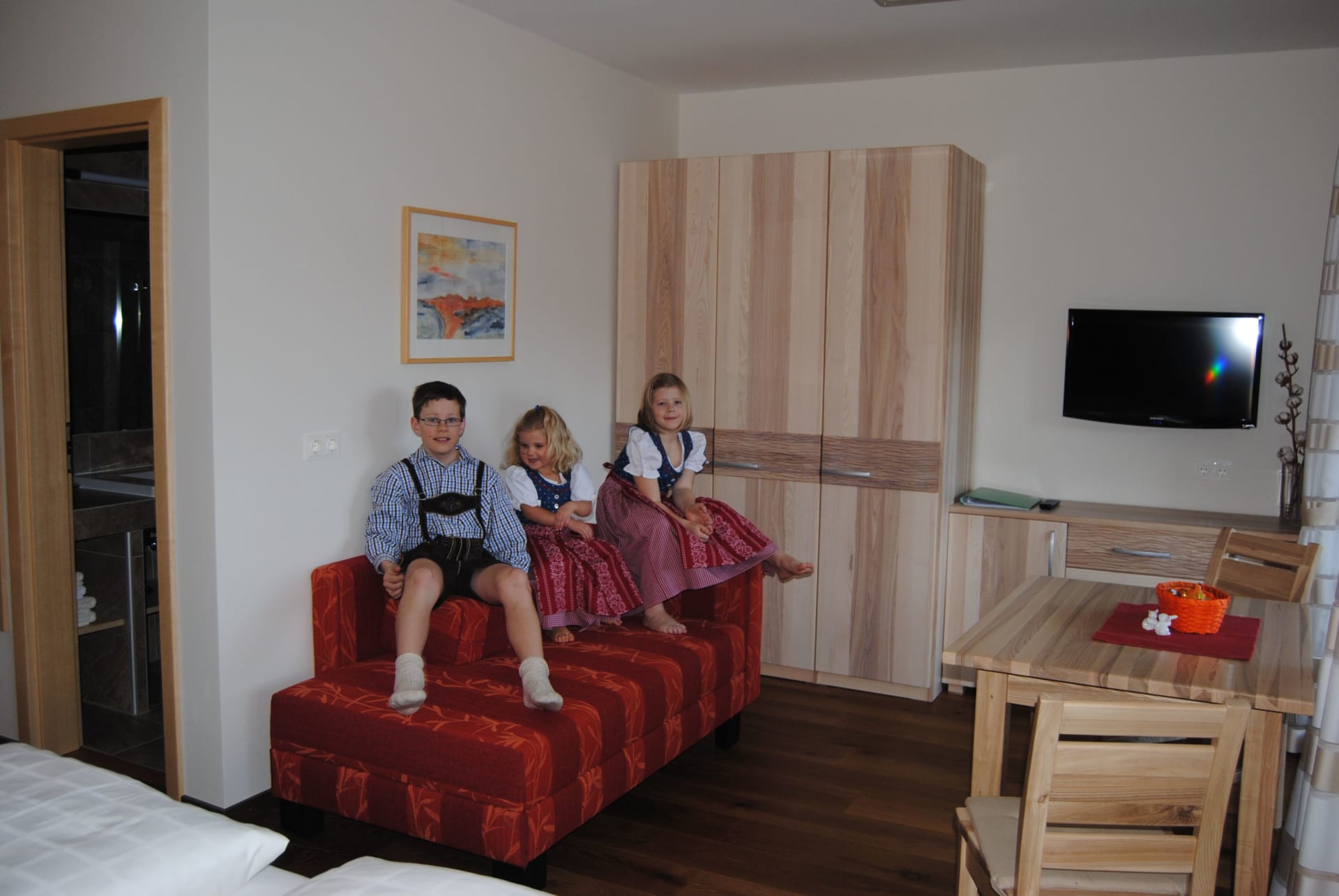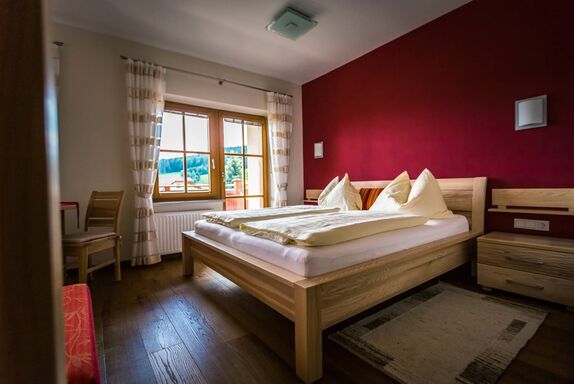 Mit Holzboden, exklusiven Eschenvollholzmöbeln, Doppelbett und Zusatzbett, Dusche/WC, Flat-TV, Radio. Reichhaltiges Frühstücksbuffet, WLAN & Parkplatz inklusive.