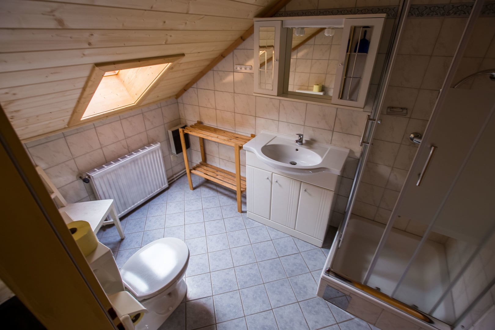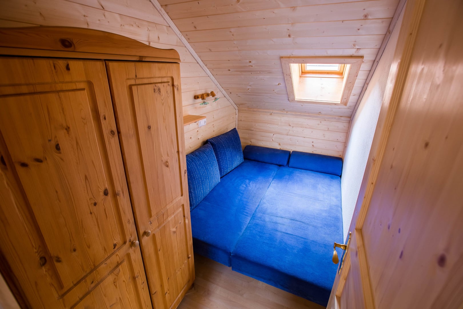 Der schräge Dachbodenausbau wirkt heimelig und in der Nacht kann man vom Bett aus den Sternenhimmel beobachten.