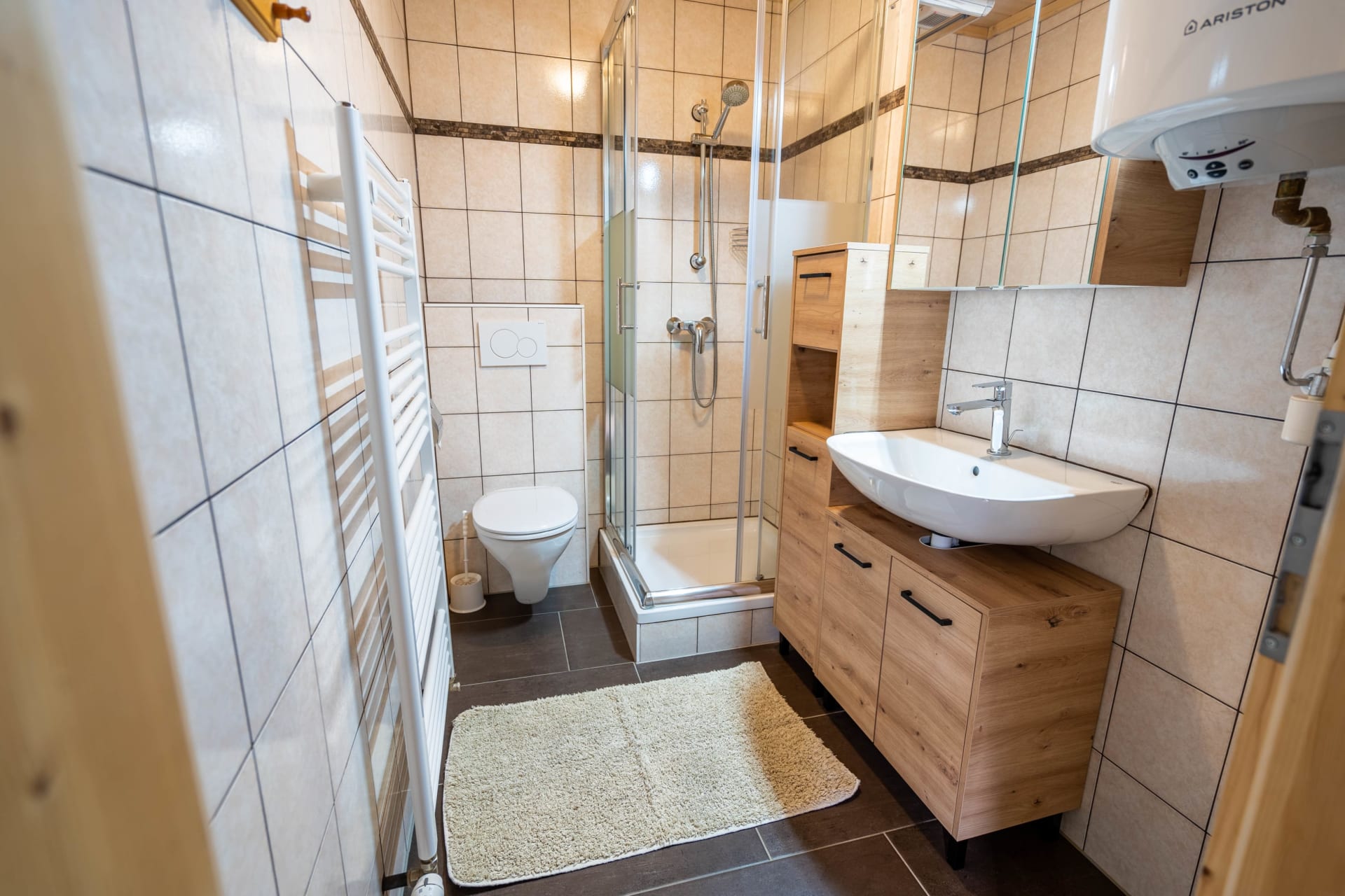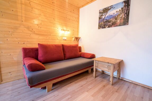 Fast alle Wände dieser Wohnung sind aus Holz und daher vermittelt sie besonders das Gefühl von Behaglichkeit und Wärme.