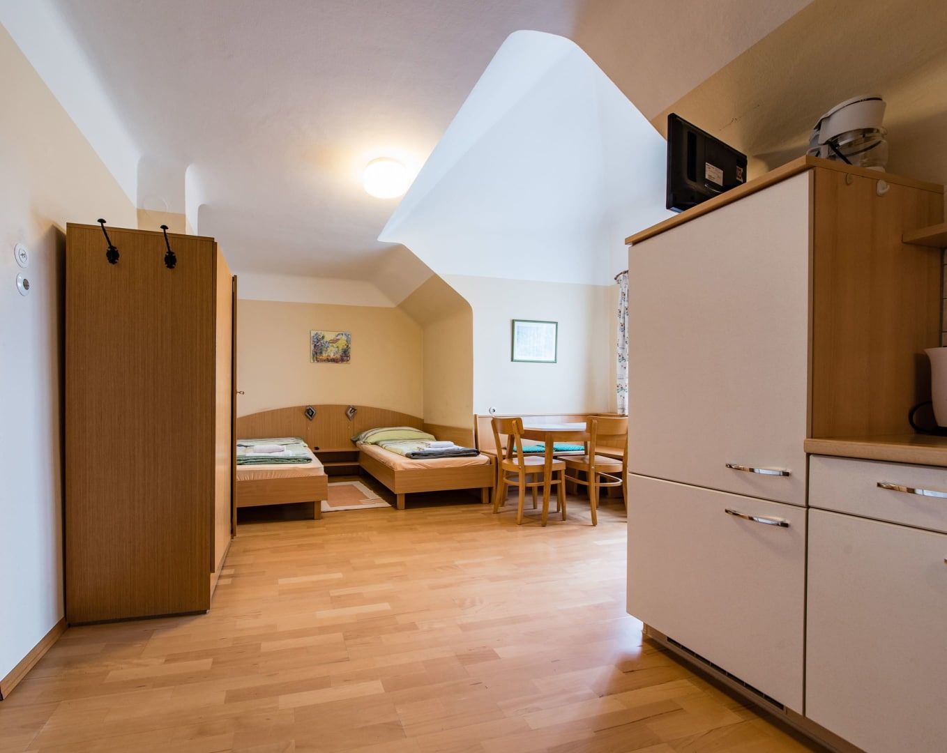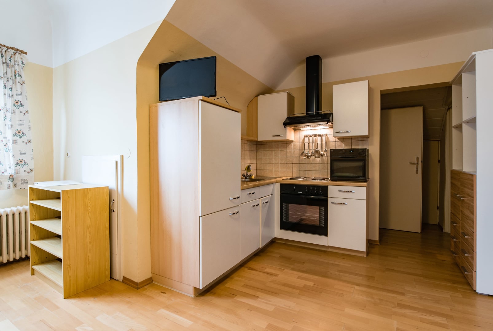 Mansardenwohnung - Wohnschlafzimmer mit Küchenblock, Bad mit WC.