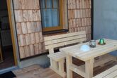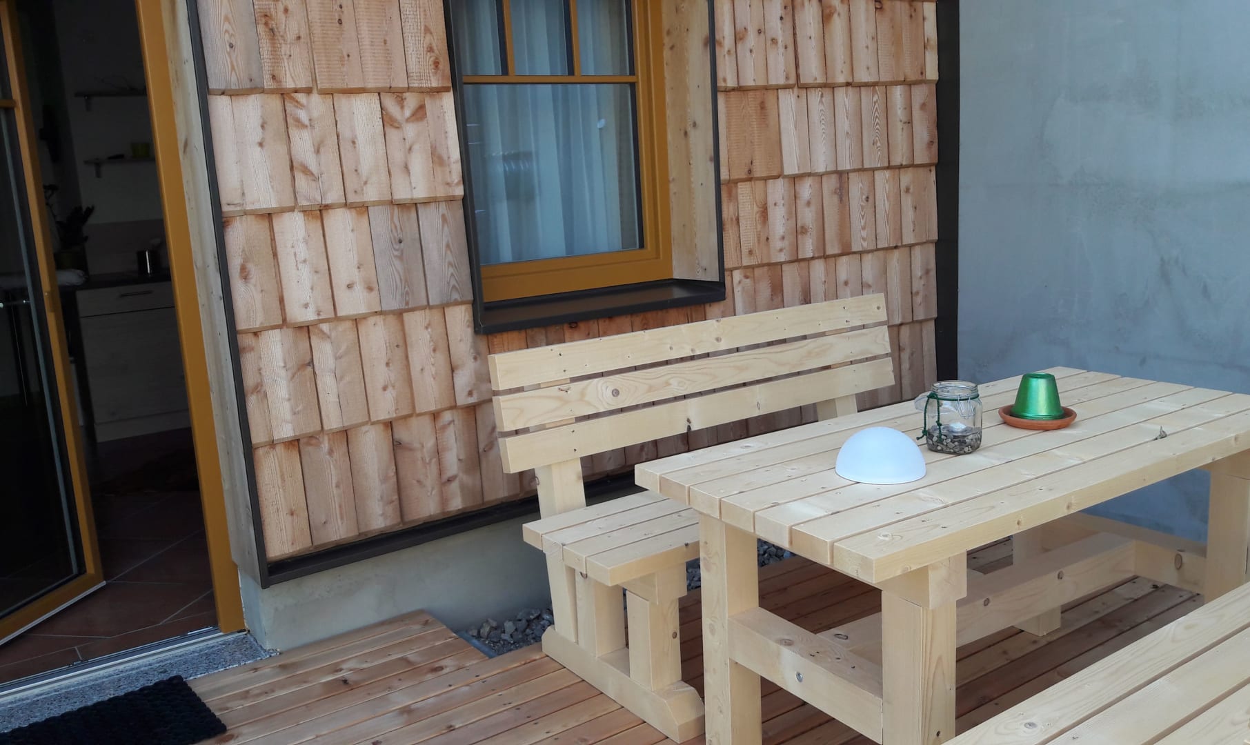 Jede Ferienwohnung hat einen eigenen Außenbereich mit Sitzgarnitur und Sonnenschirm.