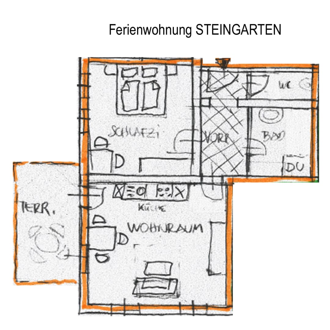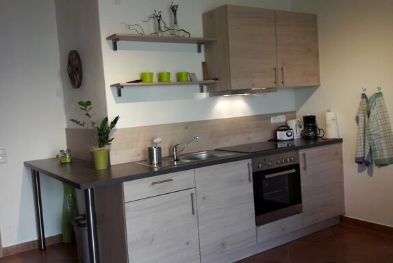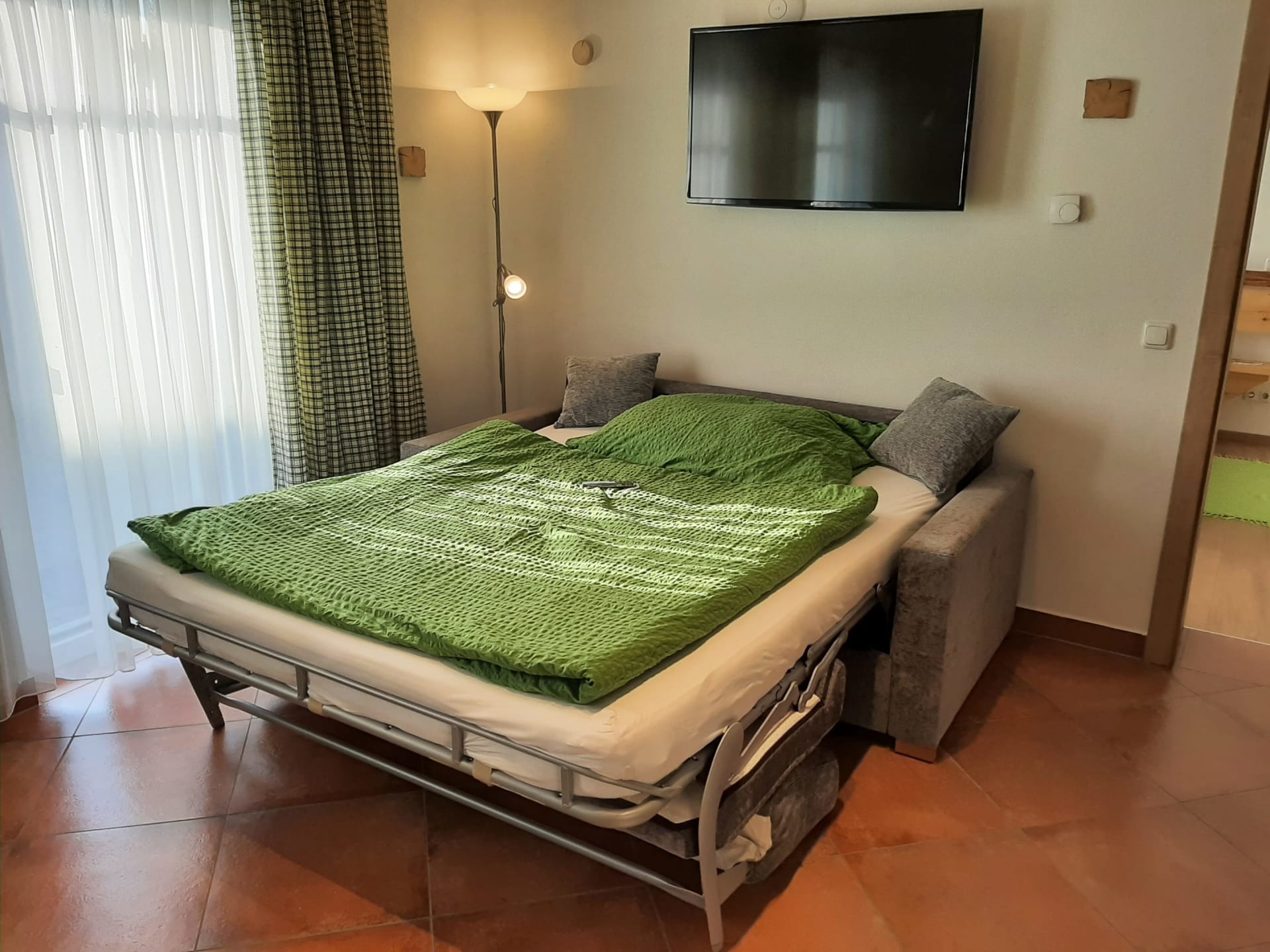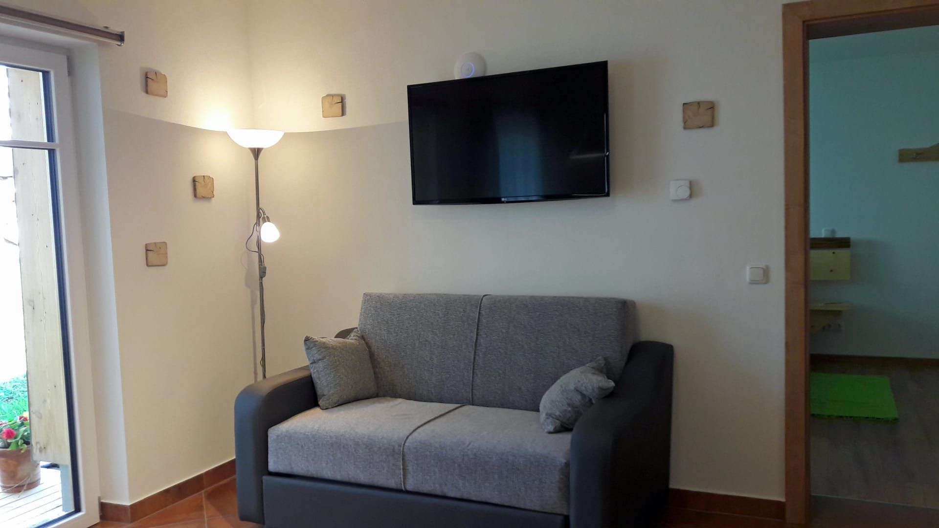 Ausgestattet mit Vorraum, WC und Bad getrennt und barrierefrei, Wohnraum mit Küchenblock (Unterbau-Kühlschrank mit Gefrierfach , E-Herd mit Backrohr, Kaffeemaschine, Teekocher, Abwasch) Sitzecke, ausziehbares Sofa, TV und Wlan, Schlafzimmer mit Doppelbett. Die Arbeitsflächen und Ausstattung der Küche befinden sich aber in Normalhöhe (Ausnahme Kühlschrank).