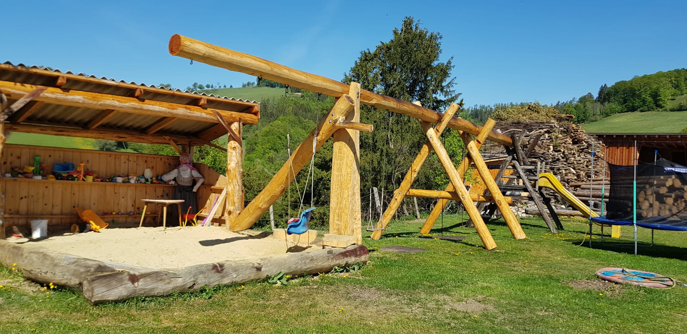 Hoftypische Besonderheiten: Unsere Gäste lieben die Produkte aus unserer eigenen Landwirtschaft. Auf die kleinen Gäste warten eine Menge Tiere die alle gestreichelt werden möchten. Der große Spielplatz lädt zu toben ein. Zufriedene Eltern relaxen auf der Hollywoodschaukel und haben die Kleinen immer im Blick.