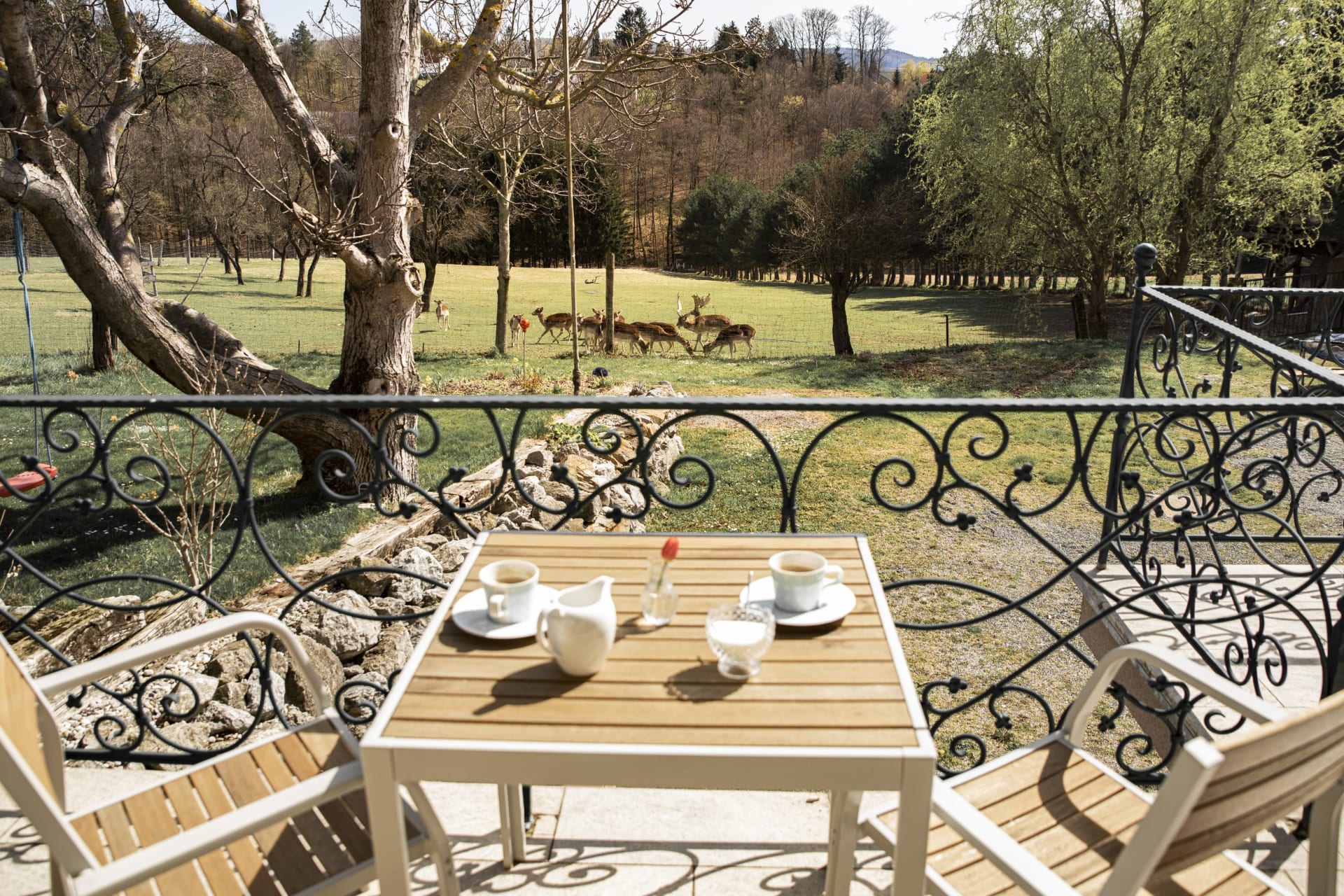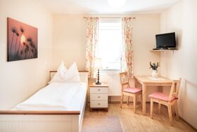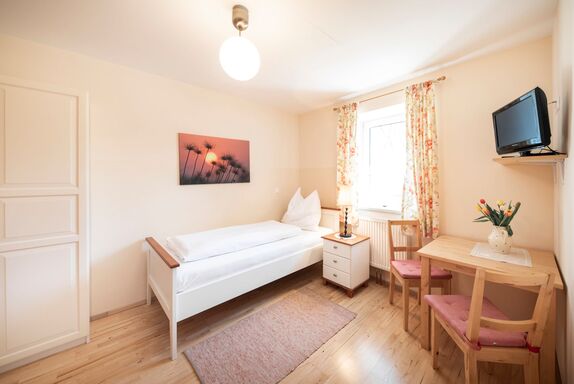 gemütliches Einzelzimmer mit Holzboden, Dusche/WC, Sat-TV, Ausblick auf den Garten bzw. das Damhirschgehe