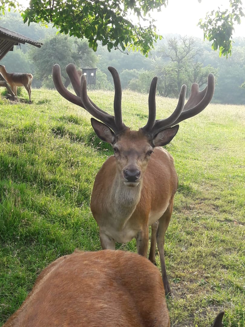 Der Hof liegt sehr idyllisch umgeben von Wald und Wiesen. Bei Ihrer Ankunft werden Sie gleich die Dam-und Rothirschgehege sehen oder es begrüßt Sie schon unsere Laufentenschar.
