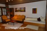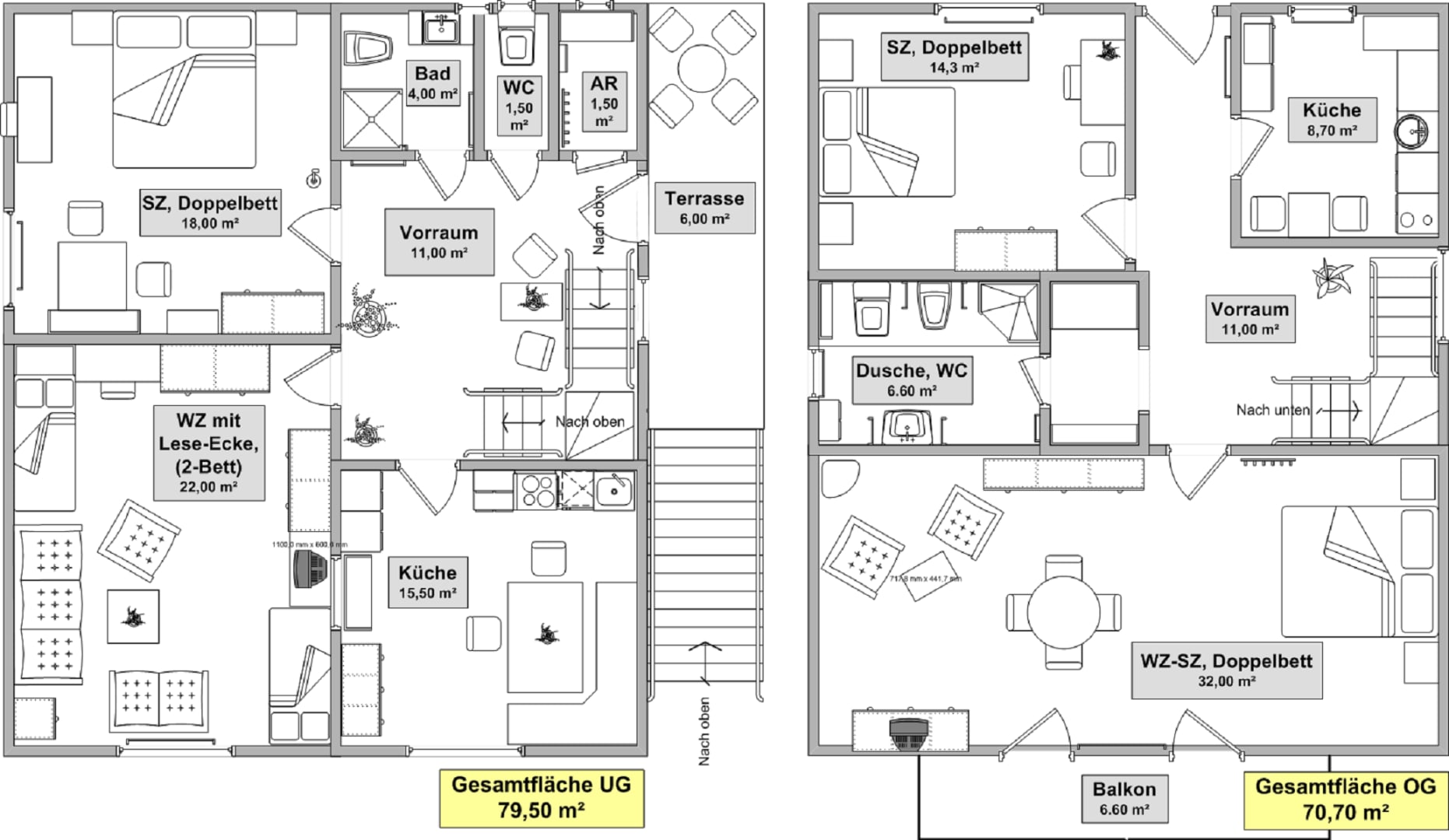 Das Ferienhaus hat eine Wohnfläche von 150m² und kann mit 2 bis 8 Personen belegt werden. Im Erdgeschoß befindet sich ein Doppelzimmer und ein Zimmer mit zwei Einzelbetten, eine Wohnküche, ein Duschbad mit Bidet und ein WC (getrennt). im Obergeschoß befindet sich ein Doppelzimmer (Queen Size) mit Wohnbereich, ein Doppelzimmer und ein Duschbad mit Bidet und WC. Das Obergeschoß kann ab der 5. Person gebucht werden.