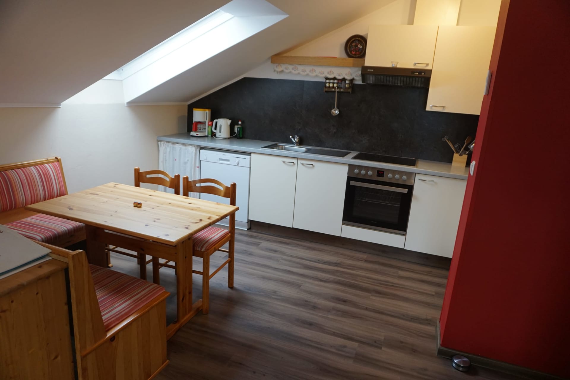 Die Wohn-Essküche ist ausgestattet mit einer Eckbank, mit Ceranfeld, Backofen, Geschirrspüler, Abwasch, Kühlschrank, Wasserkocher, Kaffeemaschine, Geschirr, Besteck und Kochtöpfe ausgestattet.