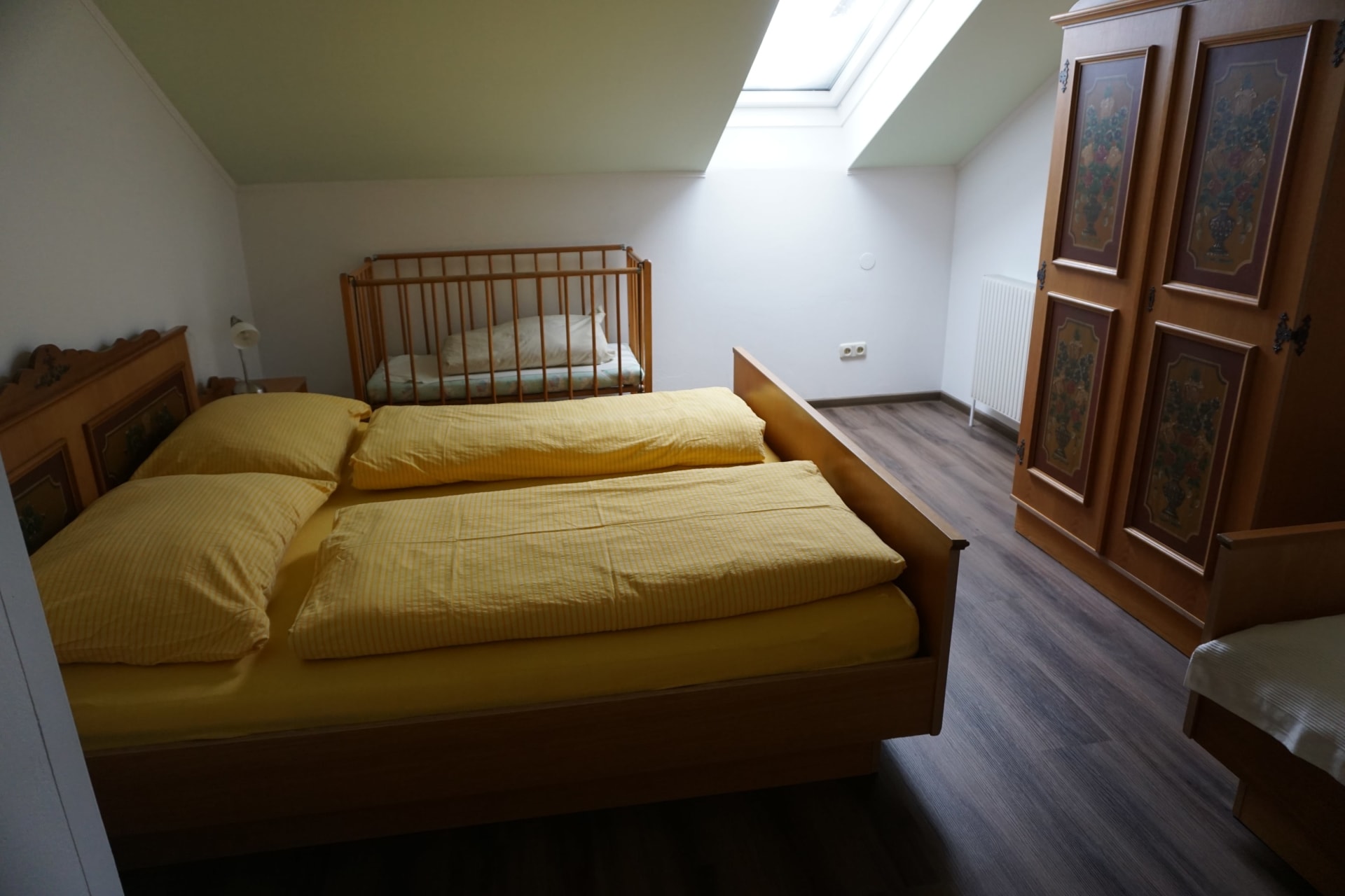 Im freundlichen, großen Schlafzimmer befindet sich ein Doppelbett, sowie ein Einzelbett.