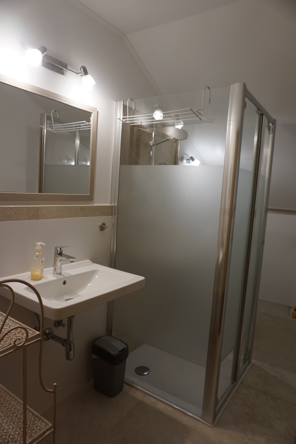 Im Bad befindet sich eine Dusche, Föhn und Waschmaschine.