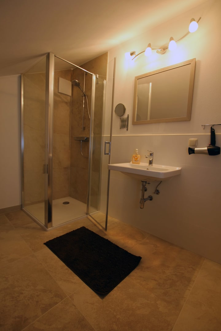 Ein Bad mit Dusche und Föhn sorgt für Komfort. Das WC ist seperat.