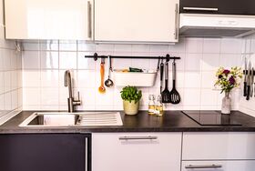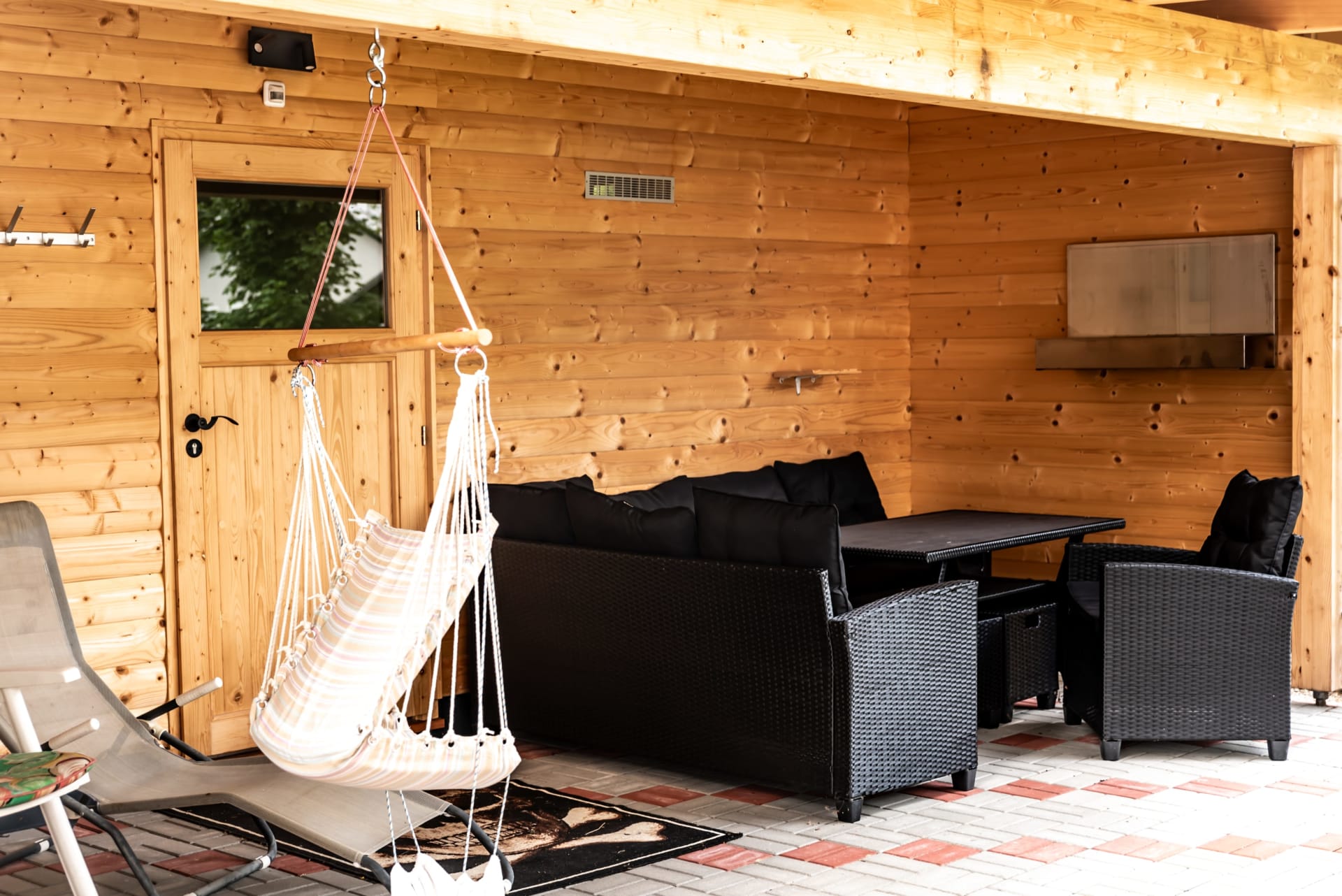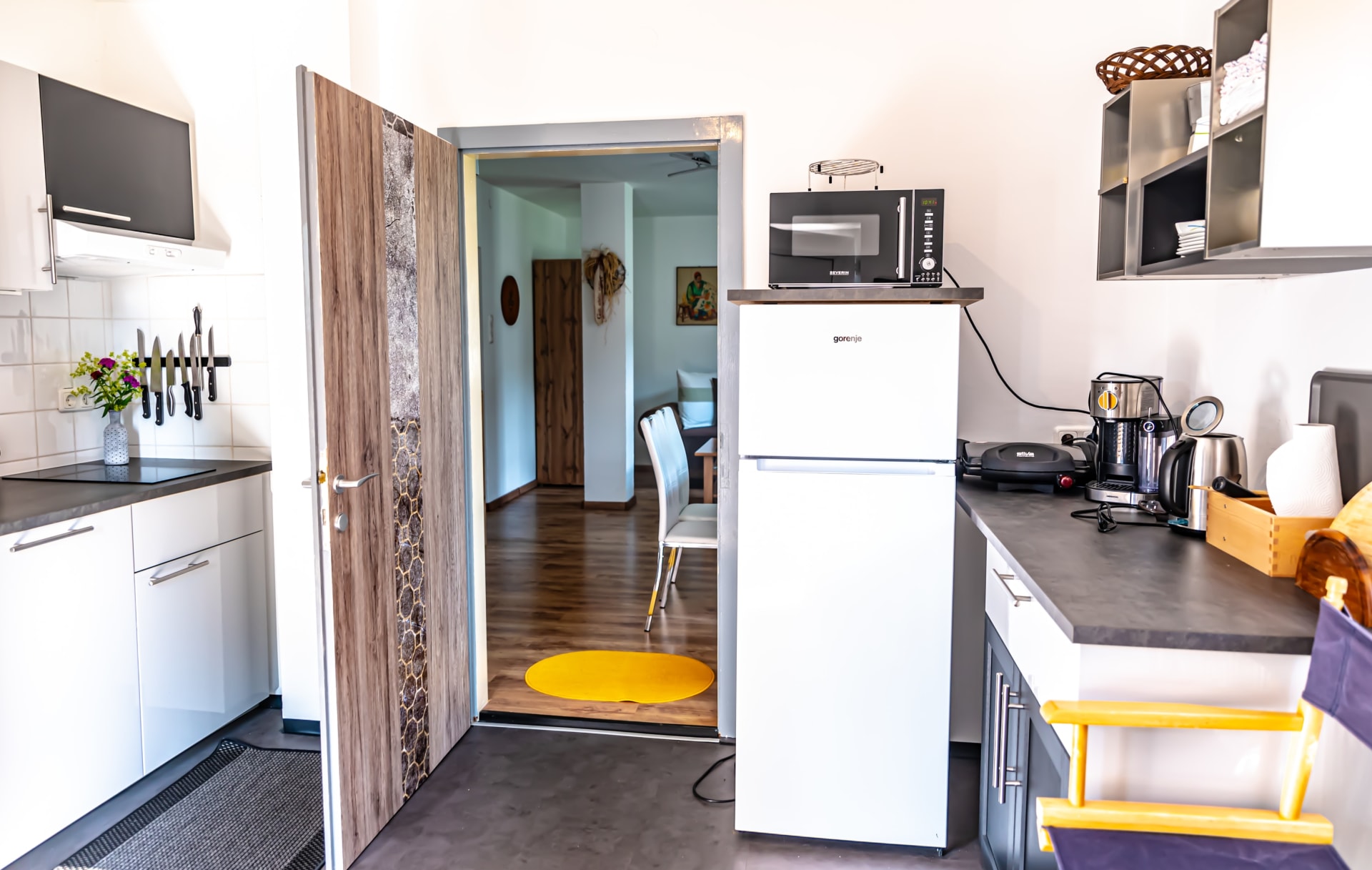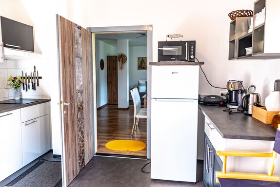 Vorraum inkl. Küche: Hier finden Sie gleich beim Eingang einen Garderobeständer und Schuhtrockner. Die Küche ist mit einem 2-Plattenkochfeld und Dunstabzugshaube, einem Geschirrspüler, einem Plattengrill- bzw. Toaster, einem Kombigerät Heißluft/Grill/Mikrowelle und einem großen Kühlschrank mit eigenem Tiefkühlteil ausgestattet. Neben einem Wasserkocher, Milchaufschäumer, elektr. Zitruspresse stehen Ihnen auch ein italienischer Espressokocher und eine Thermo-Kaffeebereiter zur Verfügung.
