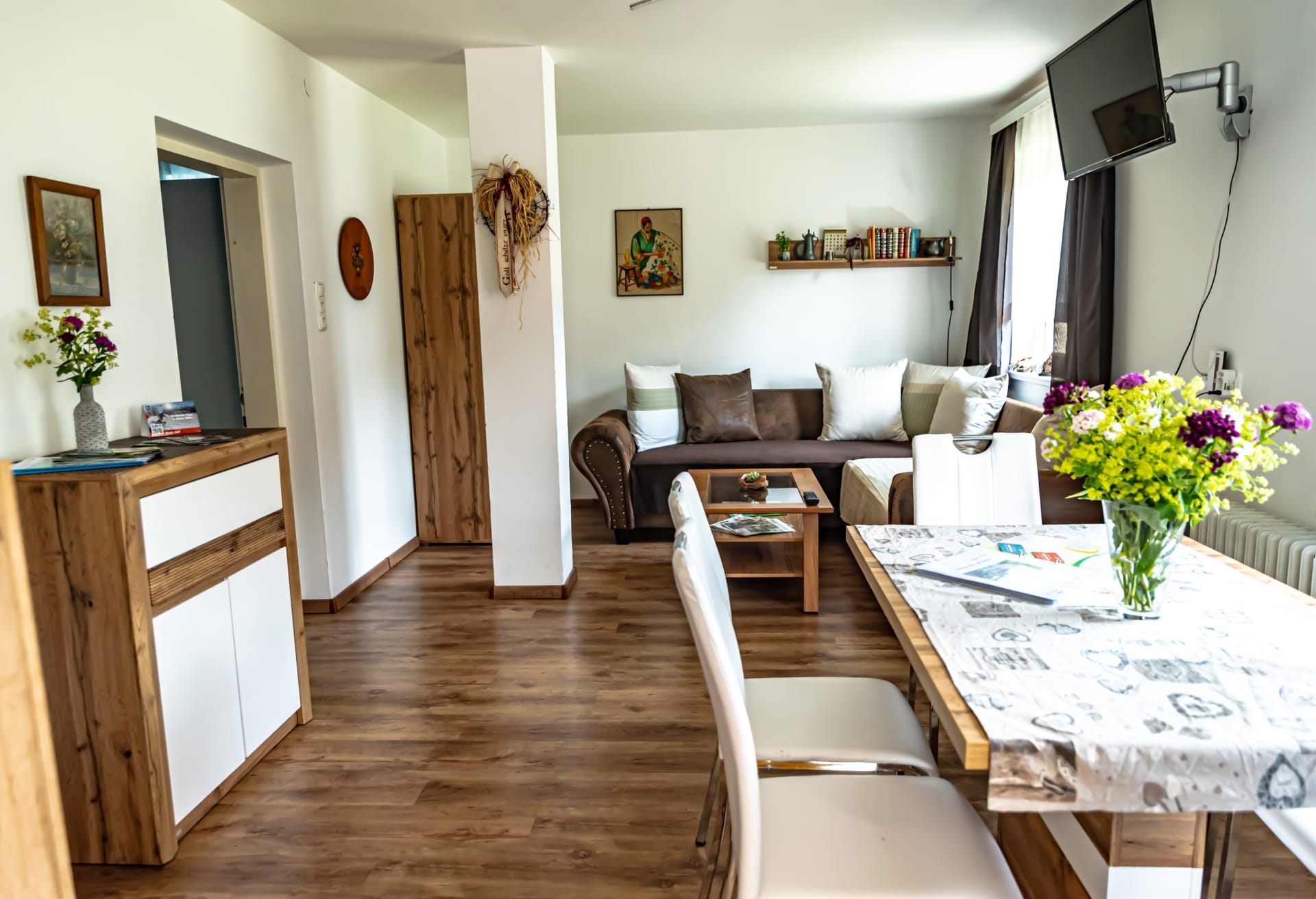 Wohn-/Esszimmer: Der Esstisch (120 x 80 cm) mit 4 Stühlen ist auf 160 cm Länge erweiterbar. In 2 Kommoden und einem geräumigen Kasten haben Sie viel Platz für Ihre persönlichen Gegenstände. Die Wohnlandschaft kann bei Bedarf sowohl als Einzelbett für Kinder (80 x 200 und 80 x 150) aber auch als Doppelbett (140 x 200) genutzt werden. In diesem Raum befindet sich auch der Fernseher (SAT) der mit einer ORF HD-Karte ausgerüstet ist. - Von diesem Zimmer gelangen Sie sowohl ins Bad wie auch ins Schlafzimmer.