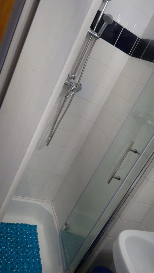Bad besteht aus einem Waschtisch mit Spiegelschrank sowie einer Dusche (80 x 80 cm)