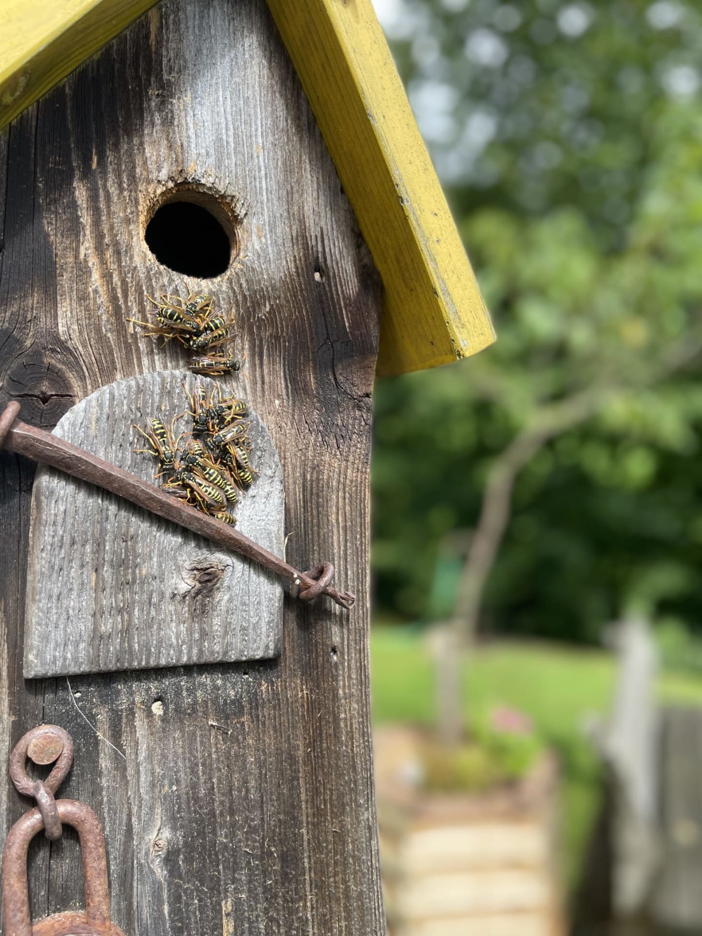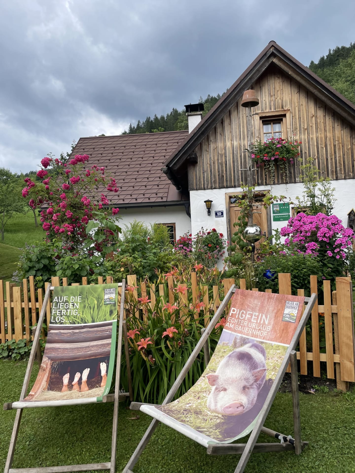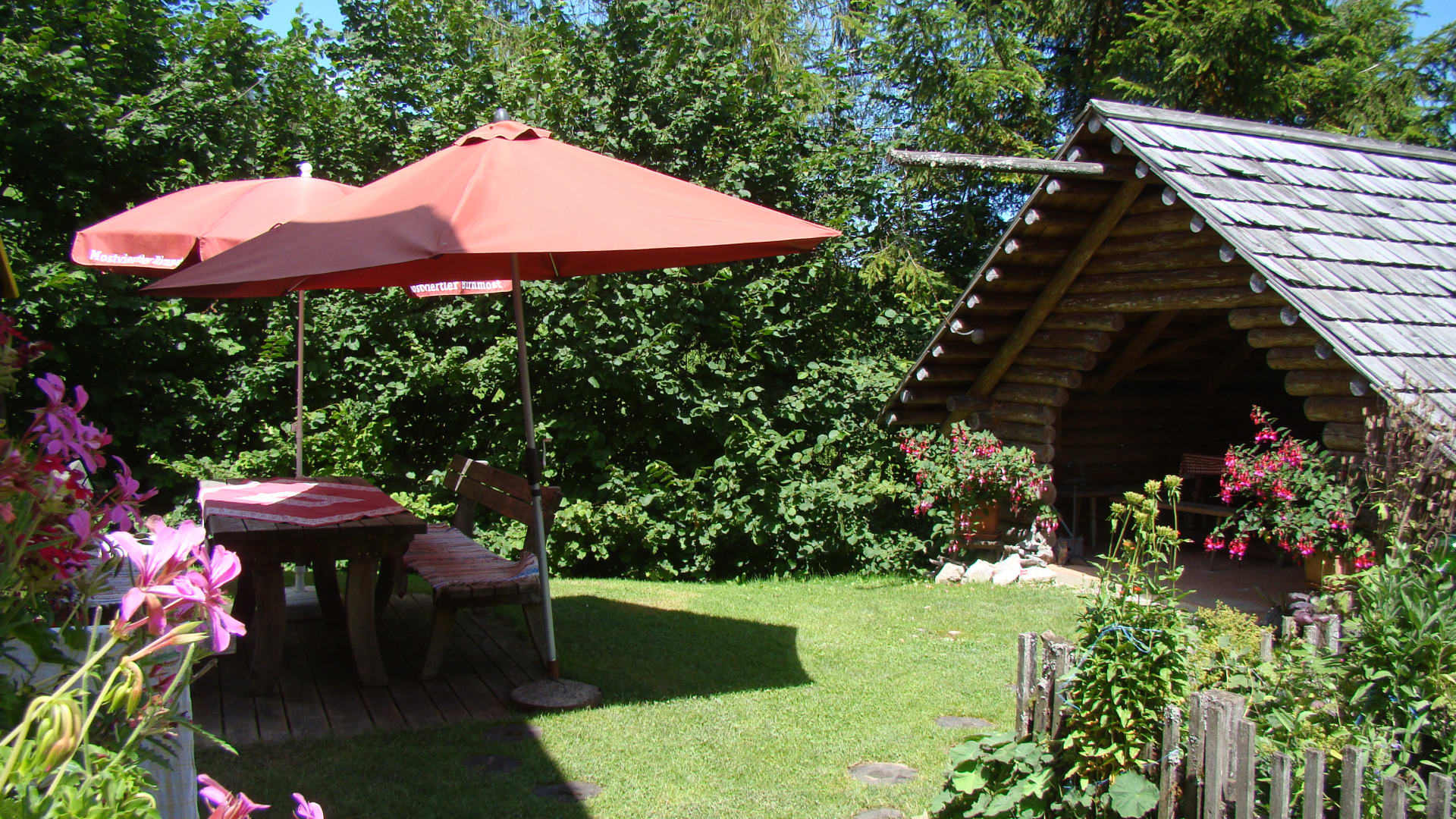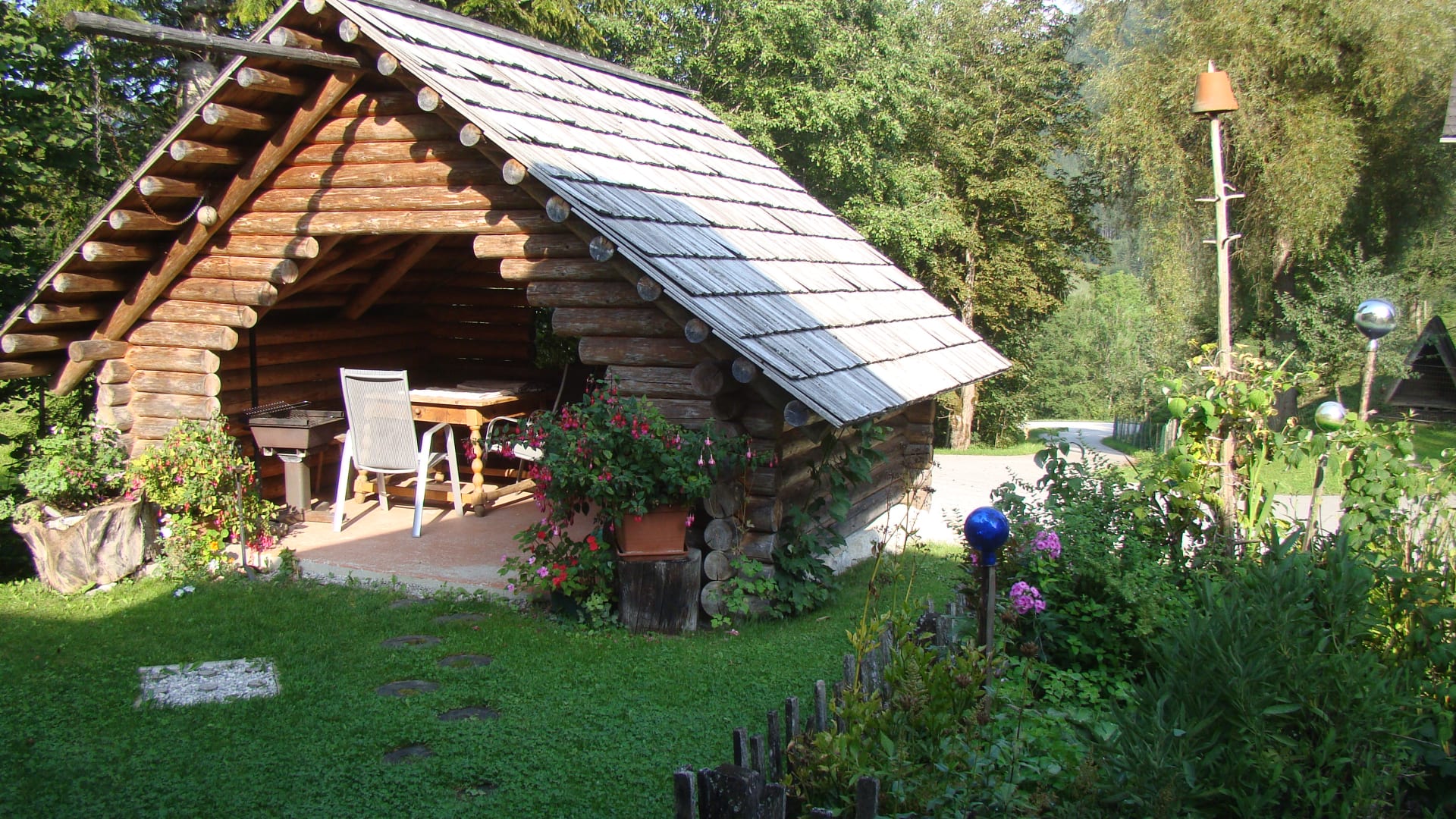 Vor dem Ferienhaus eine gemütliche Sitzgelegenheit neben dem Fischteich