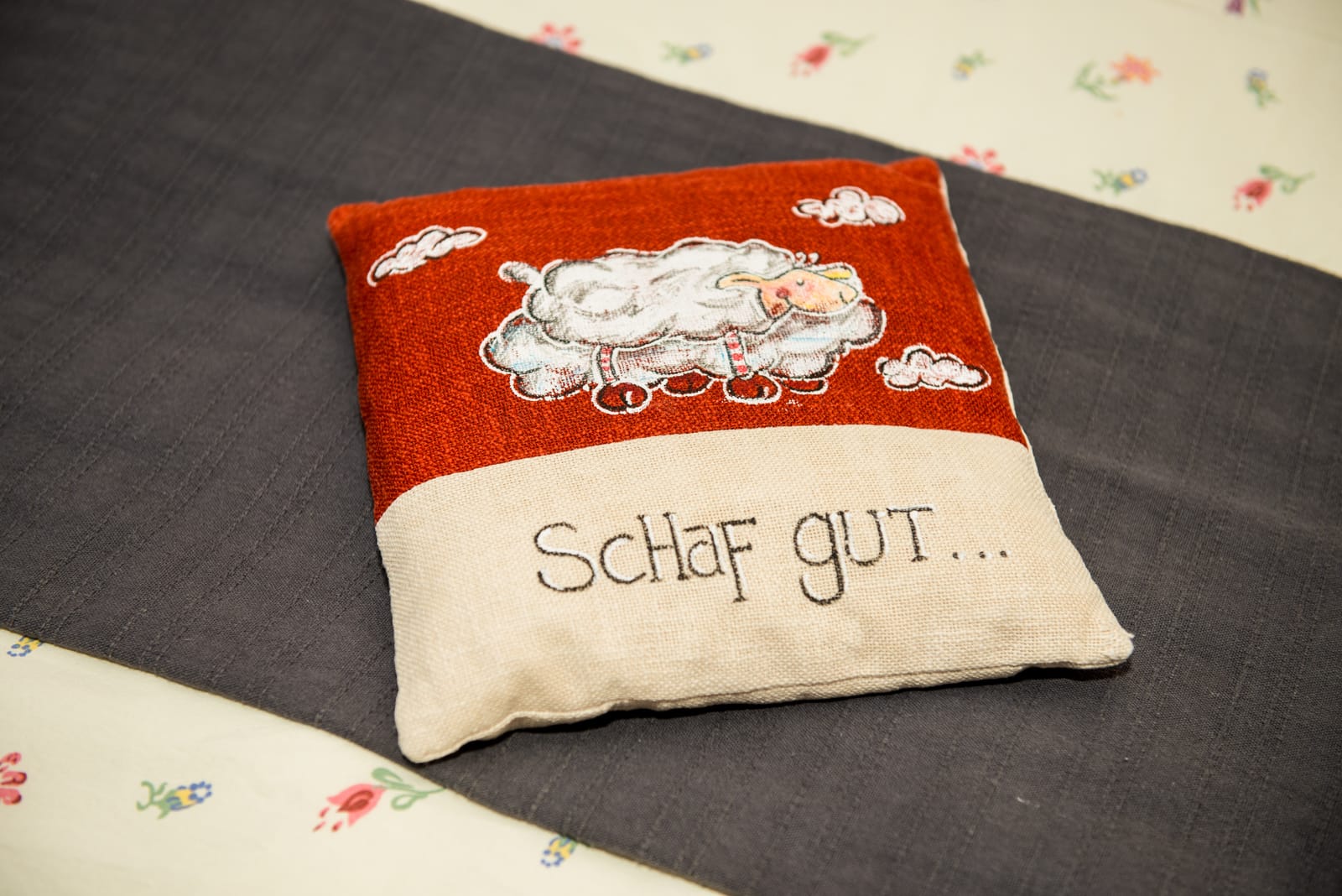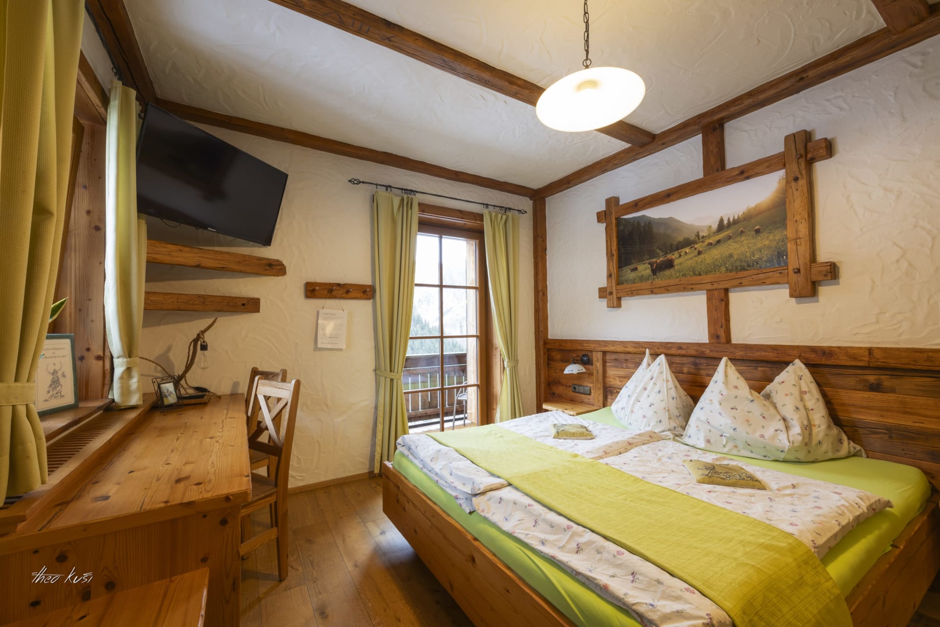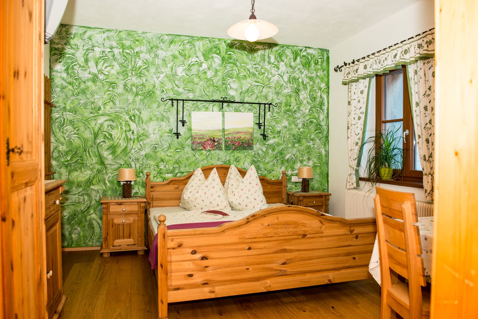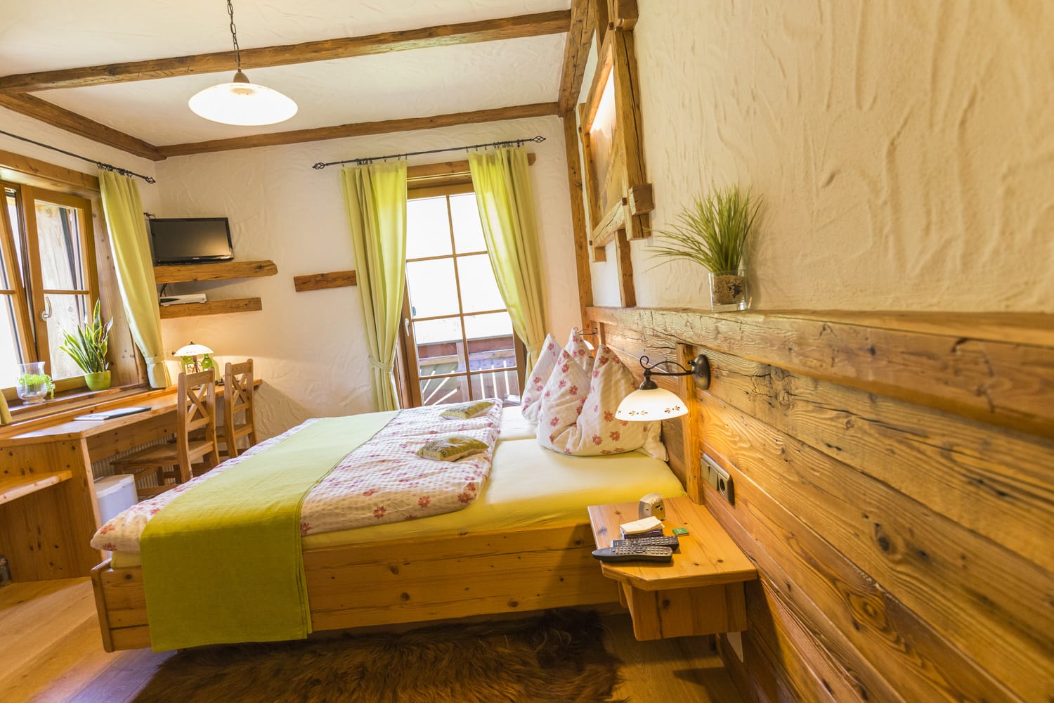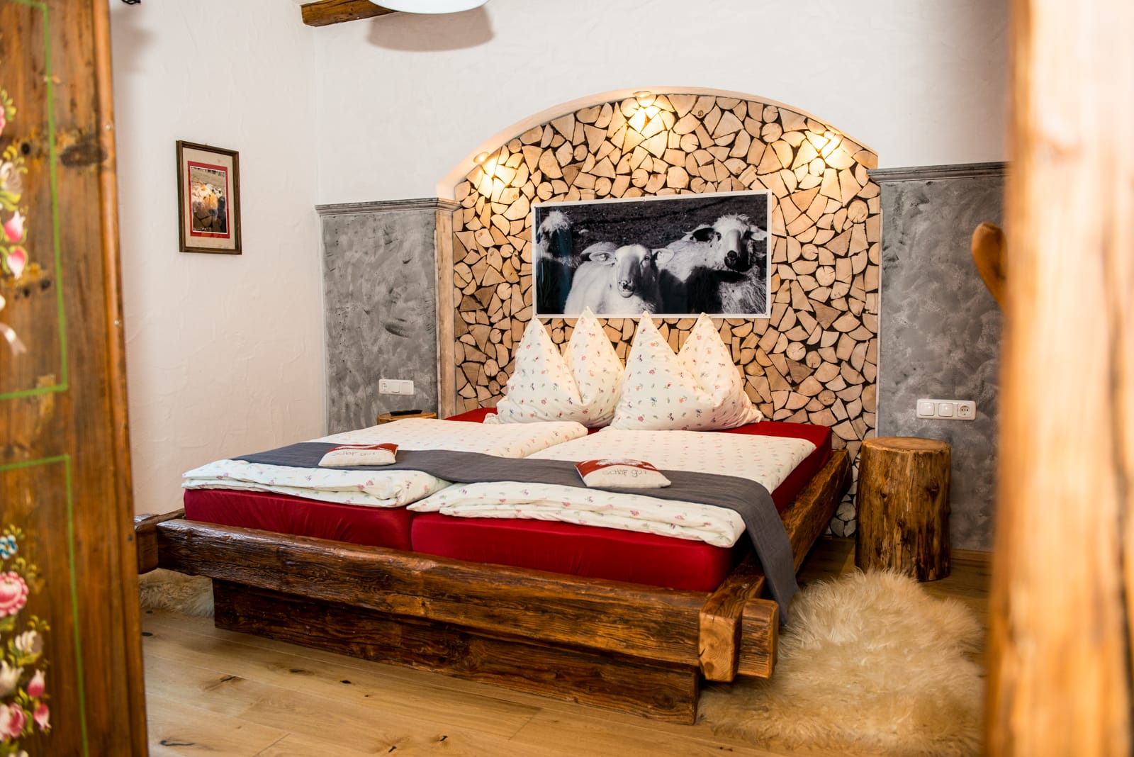 Unser Zottelzimmer bietet Platz für 2 Personen. Das liebevoll eingerichtete Zimmer ist mit Altholzmöbel und Holzfußboden ausgestattet.