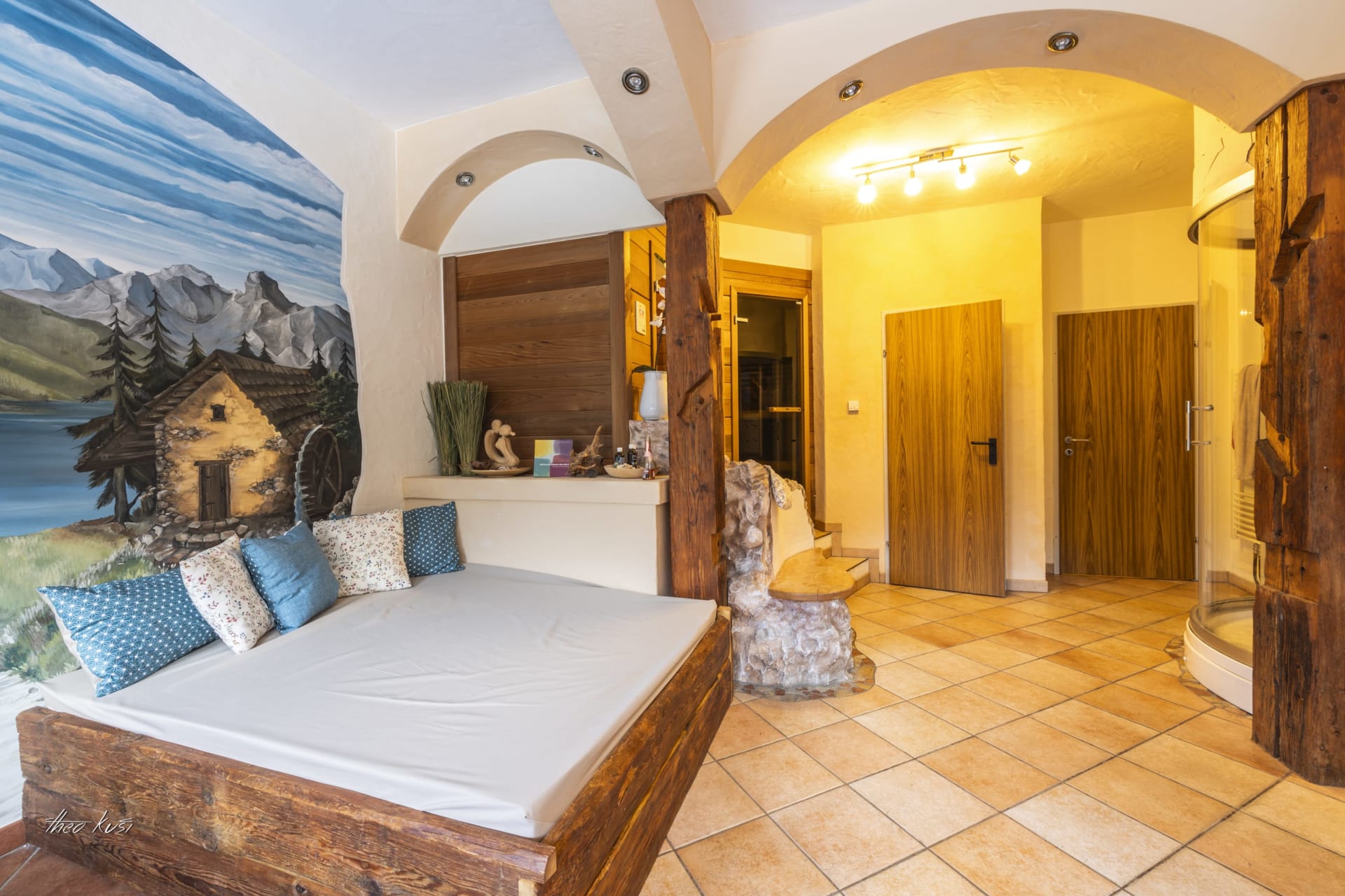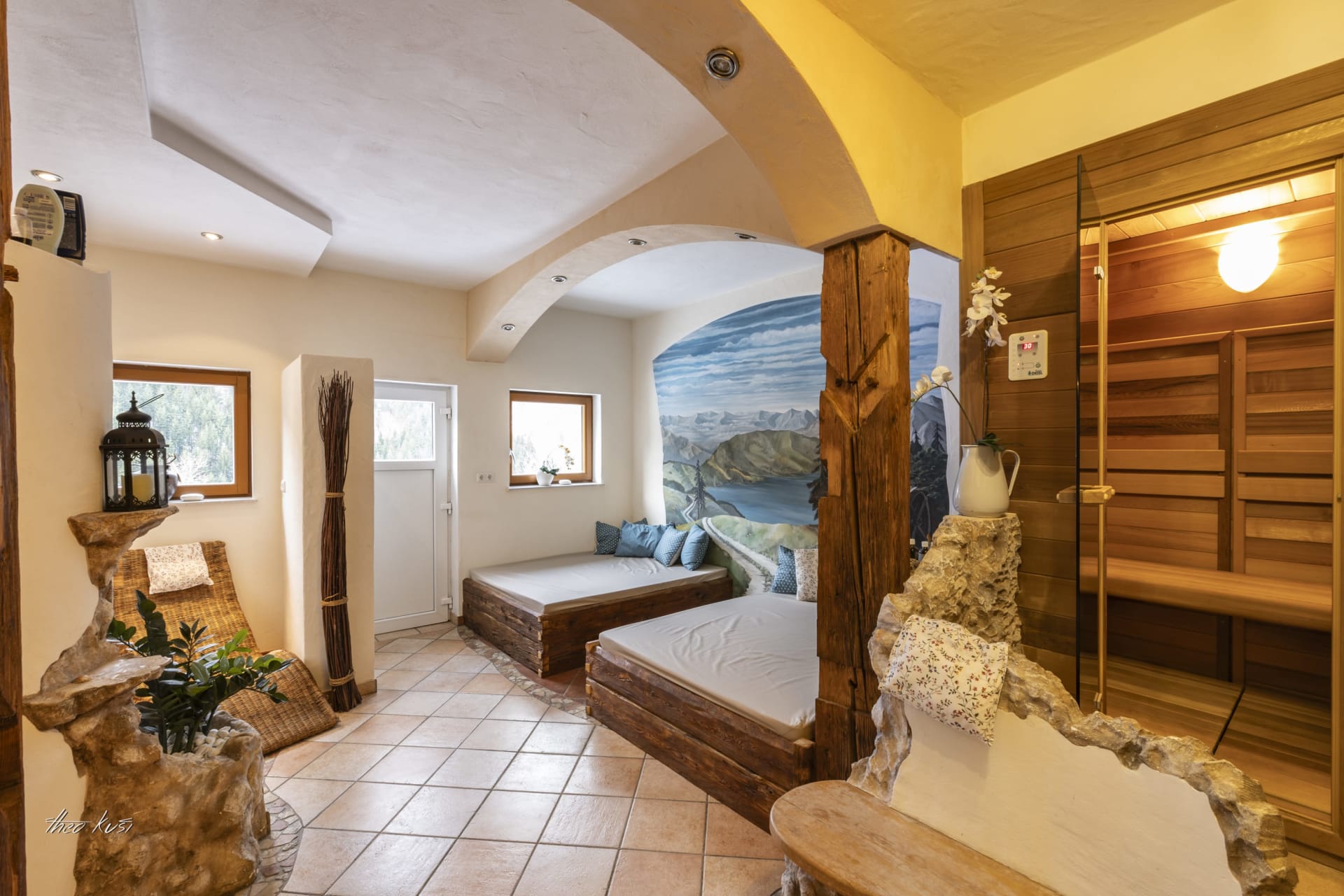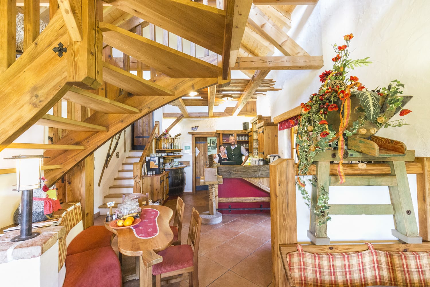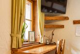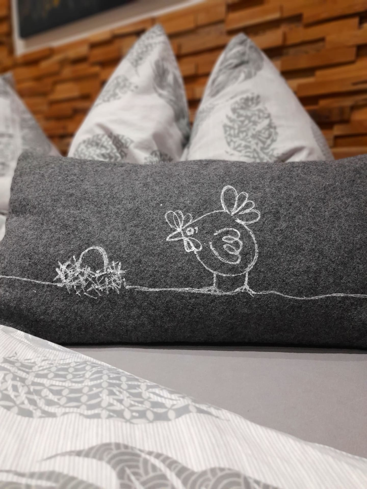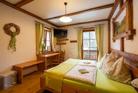 Unser Zottelzimmer bietet Platz für 2 Personen. Das liebevoll eingerichtete Zimmer ist mit Altholzmöbel und Holzfußboden ausgestattet.