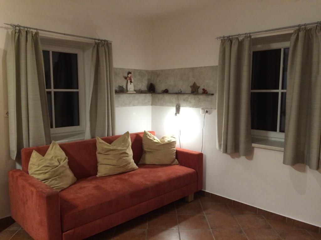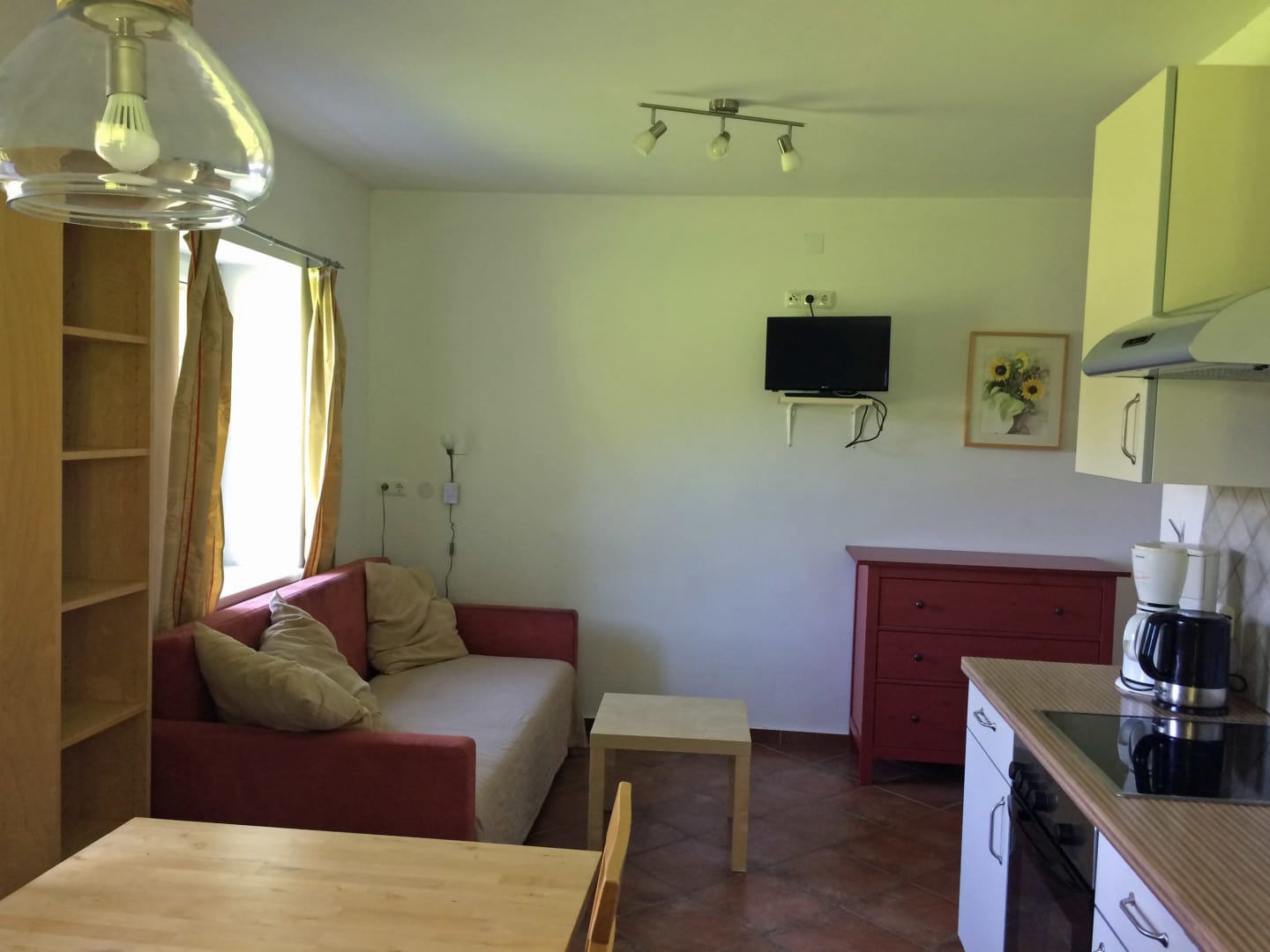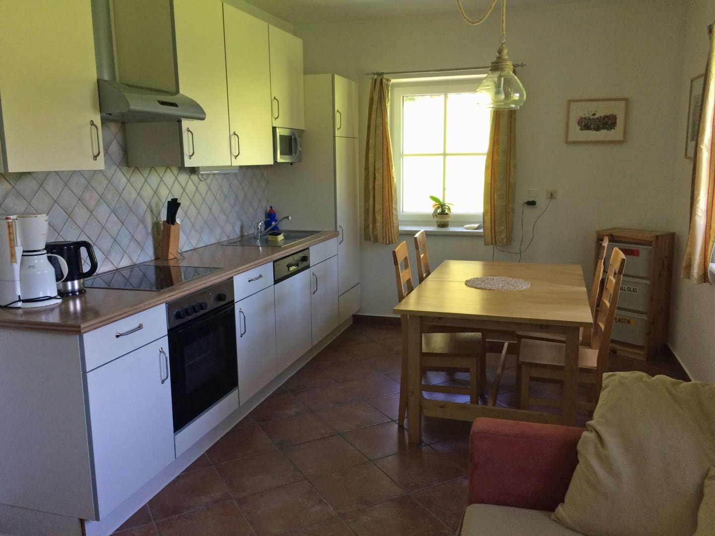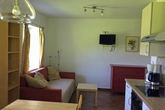 Unsere Ferienwohnung Eierschwammerl ist ein freundlich, gemütlich eingerichtetes Appartment, das durch eine Attraktion besonders bei den Kindern beliebt ist, ein GLASBODEN indem man in den Streichelzoo schauen kann. Vorraum, großes Bad, Schlafzimmer mit einem Doppelbett, Wohnküche mit Ausziehcouch.