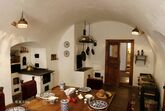 • eine neue Küche mit einer kleinen Speise- und Geschirrkammer. Durch eine Bodenklappe kann man in den kleinen Weinkeller hinuntersteigen.
