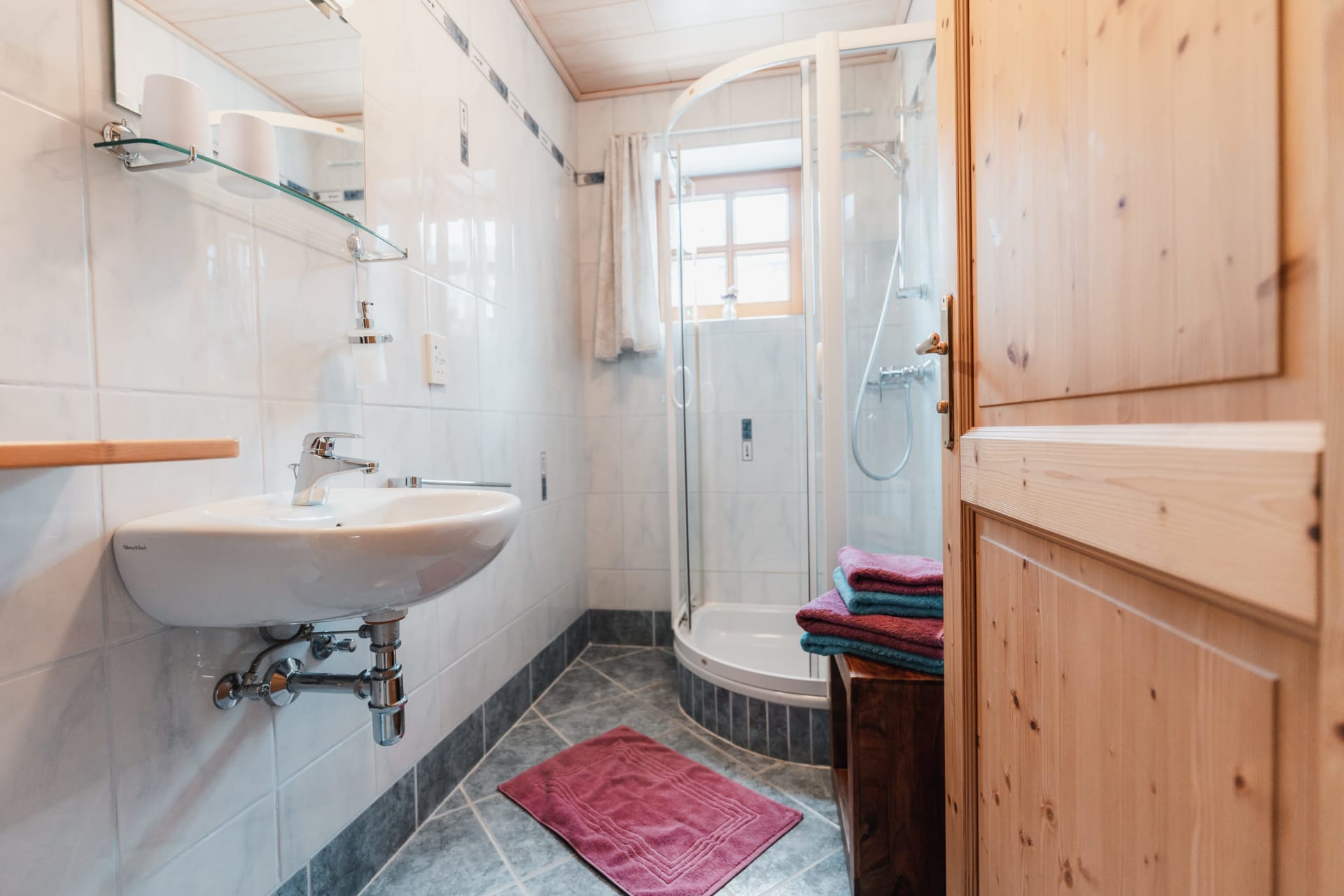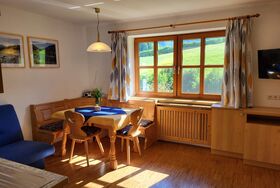 Die helle, freundliche, mit Vollholzmöbel und Holzfußböden ausgestattete Ferienwohnung Bergsee bietet Ausblick Richtung Westen, auf unsere Wiesen und einen nahegelegenen Berg.