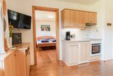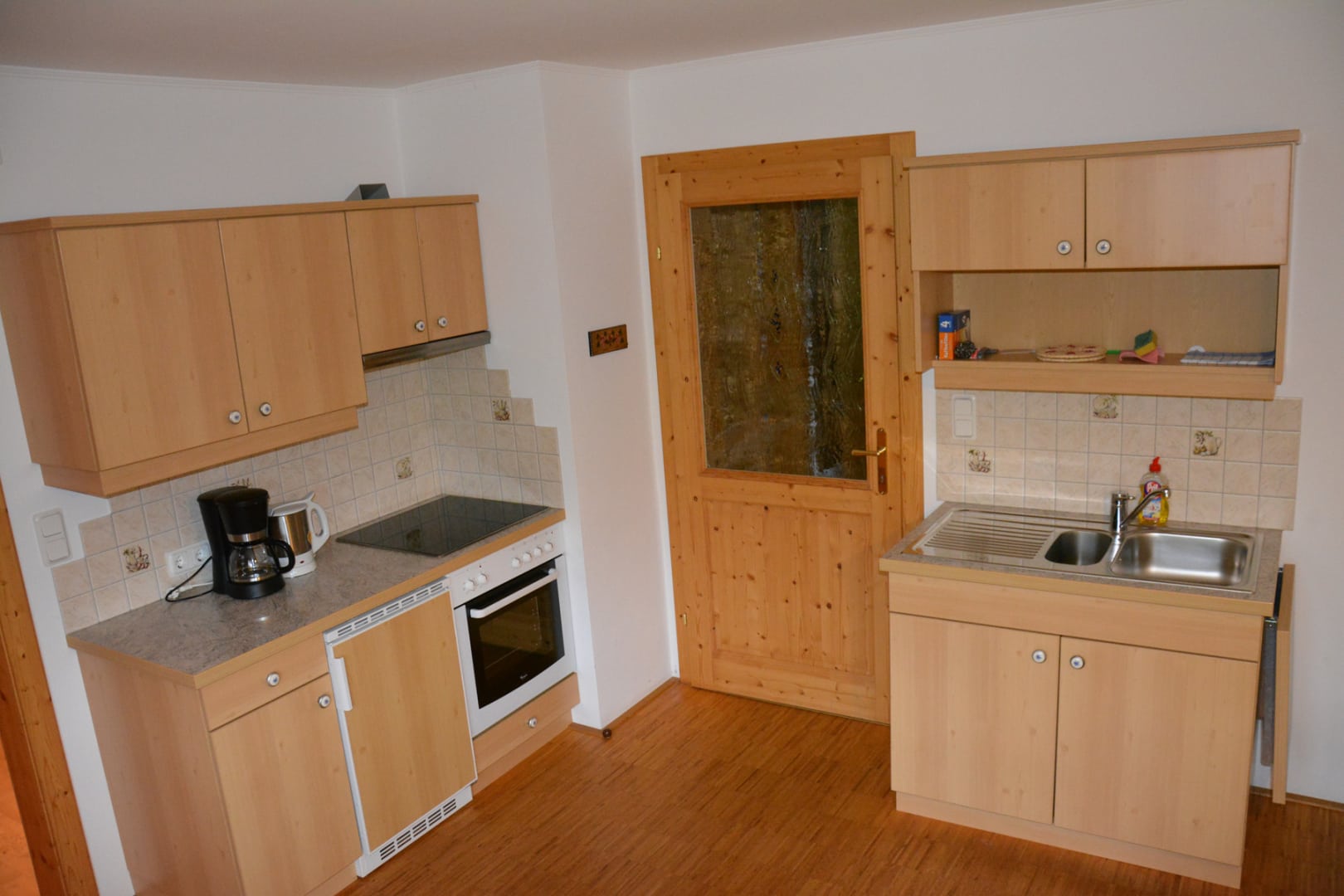 • einer Wohnküche mit Eckbank, großer, voll ausgestatteter Küchenzeile mit E-Herd und Backrohr, Kühlschrank mit Gefrierfach, Geschirrspüler, Filterkaffeemaschine, Wasserkocher,... und Schlafsofa,