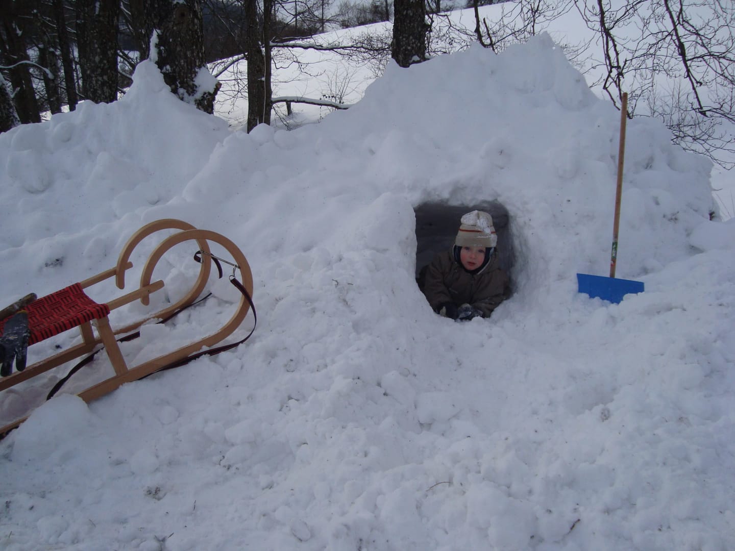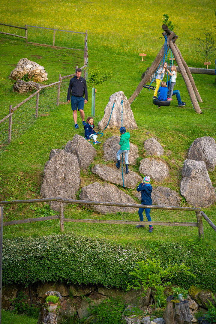Auf die Kinder wartet ein Erlebnisspielplatz am kleinen Bach, wo sie im Schnee herumtollen können, Schneemänner bauen, eine Schneeballschlacht machen, und vieles mehr.
