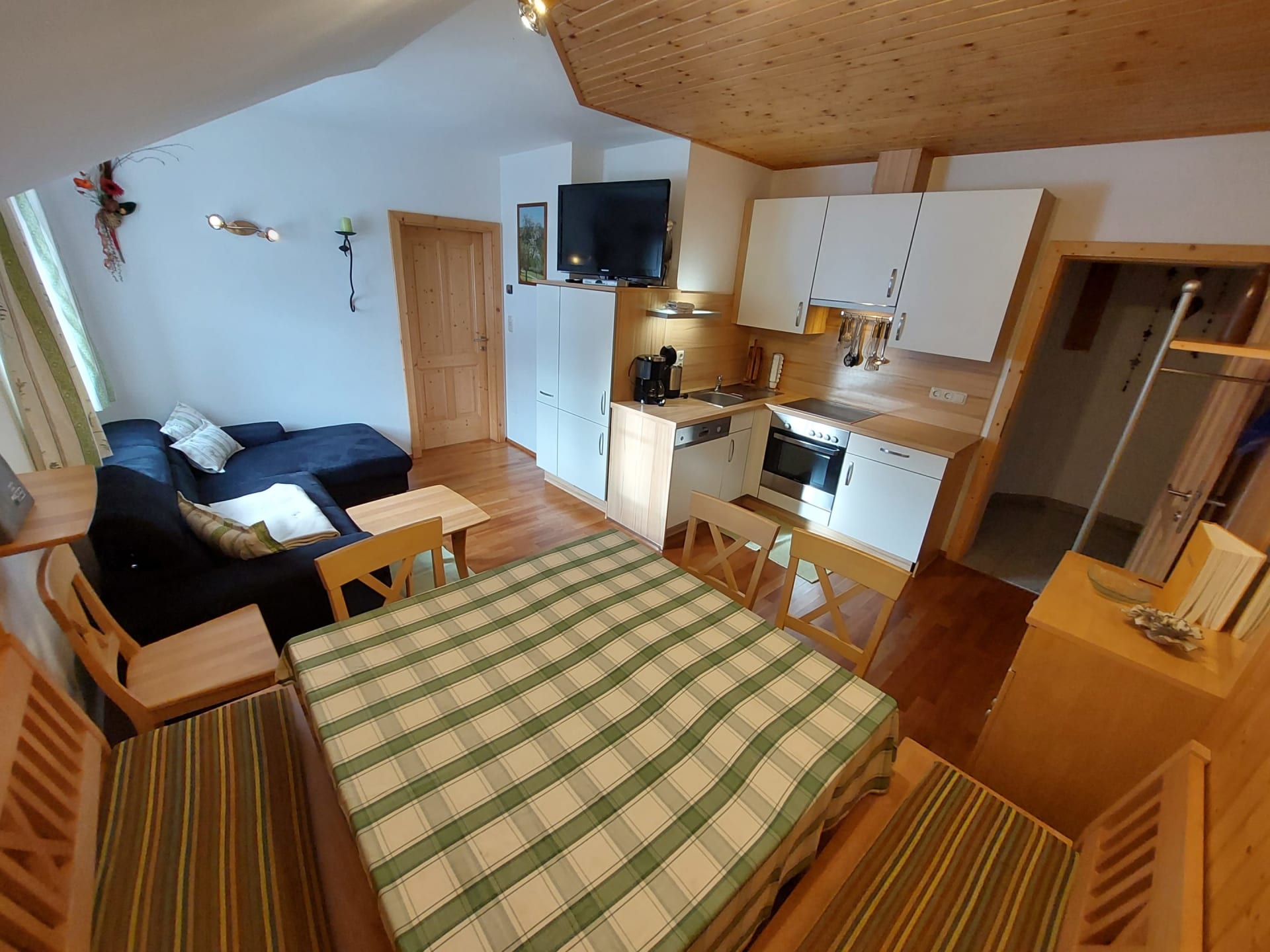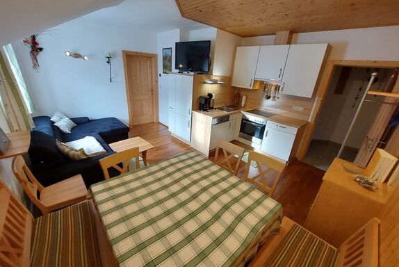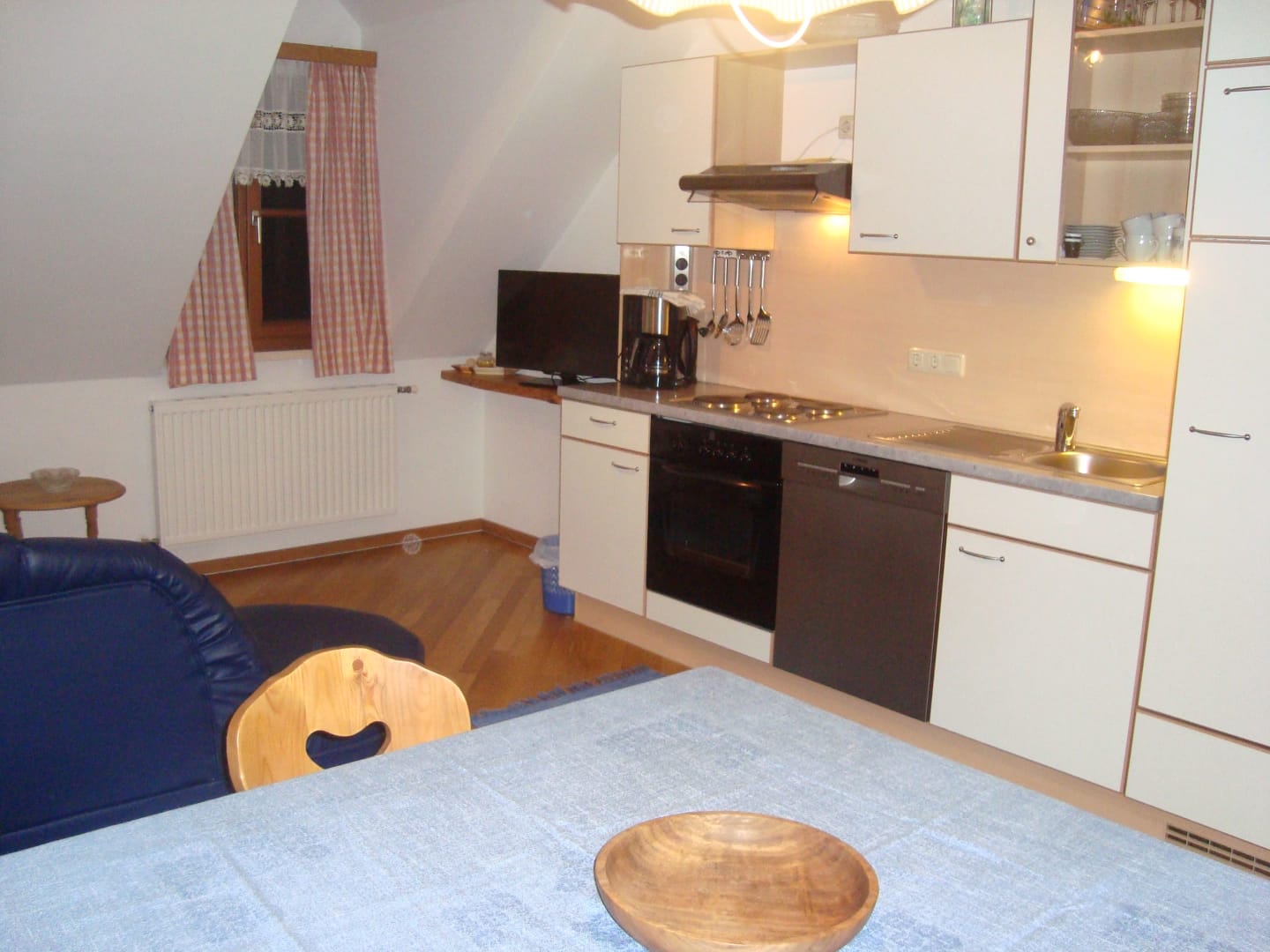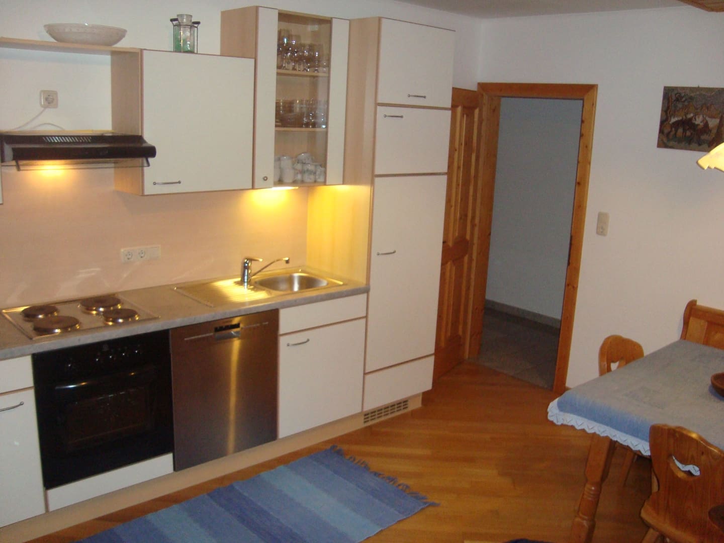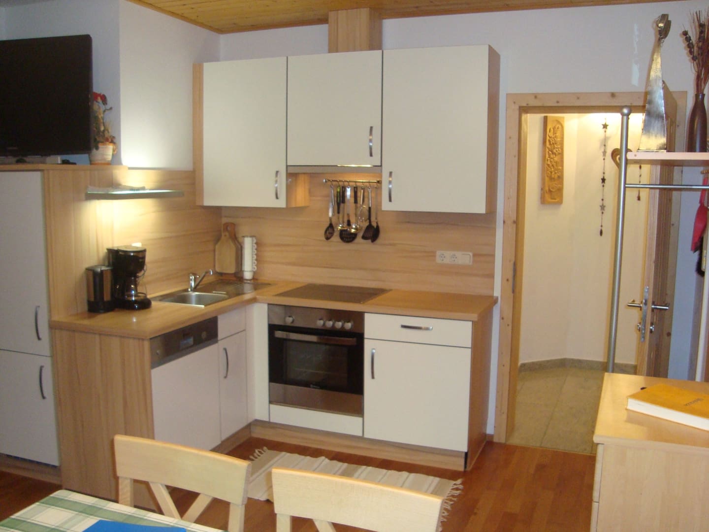 Sie hat eine gemütliche Wohnküche diese ist mit E-Herd mit Backrohr, Kühlschrank mit Gefrierfach, Geschirr, Geschirrspüler, Kaffeemaschine, Wasserkocher, Waschmaschine, drei Fernseher, Radio, Gratis W-Lan, usw. ausgestattet.