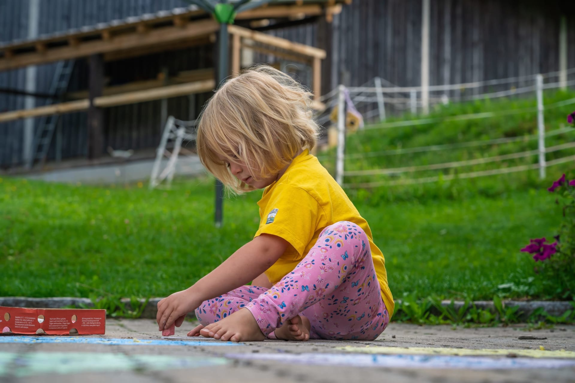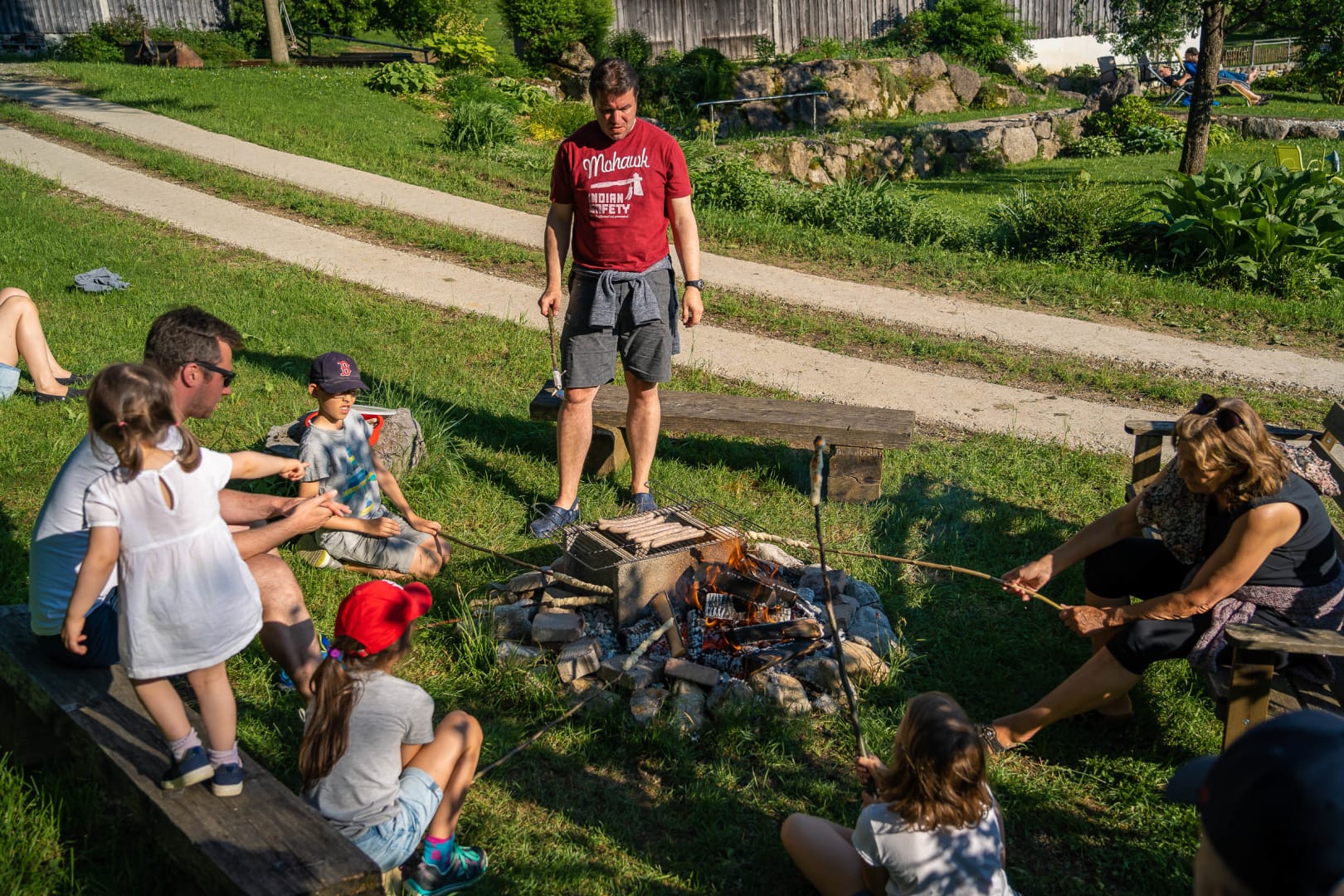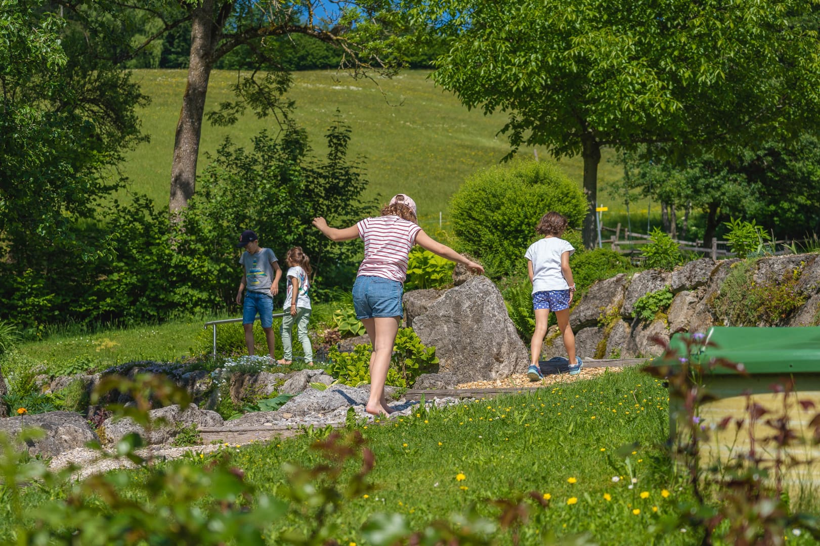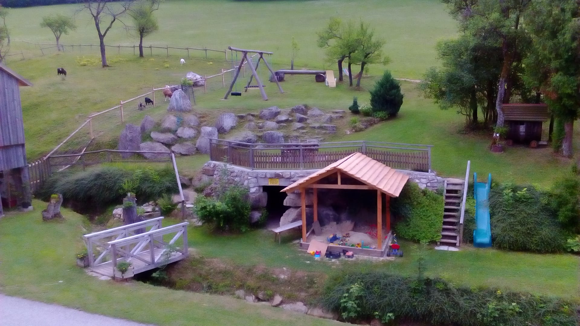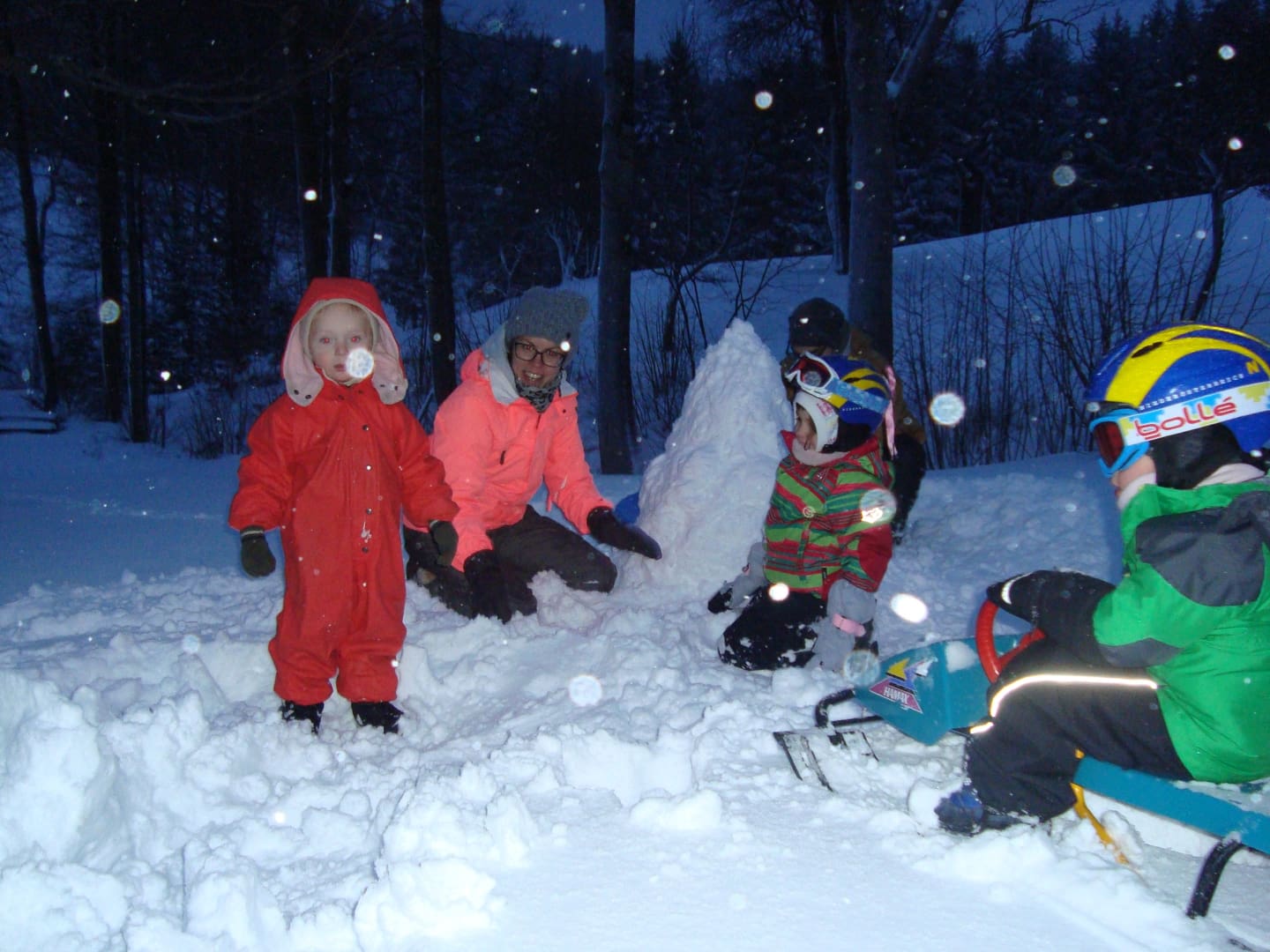Auf die Kinder wartet ein Erlebnisspielplatz am kleinen Bach, wo sie im Schnee herumtollen können, Schneemänner bauen, eine Schneeballschlacht machen, und vieles mehr.