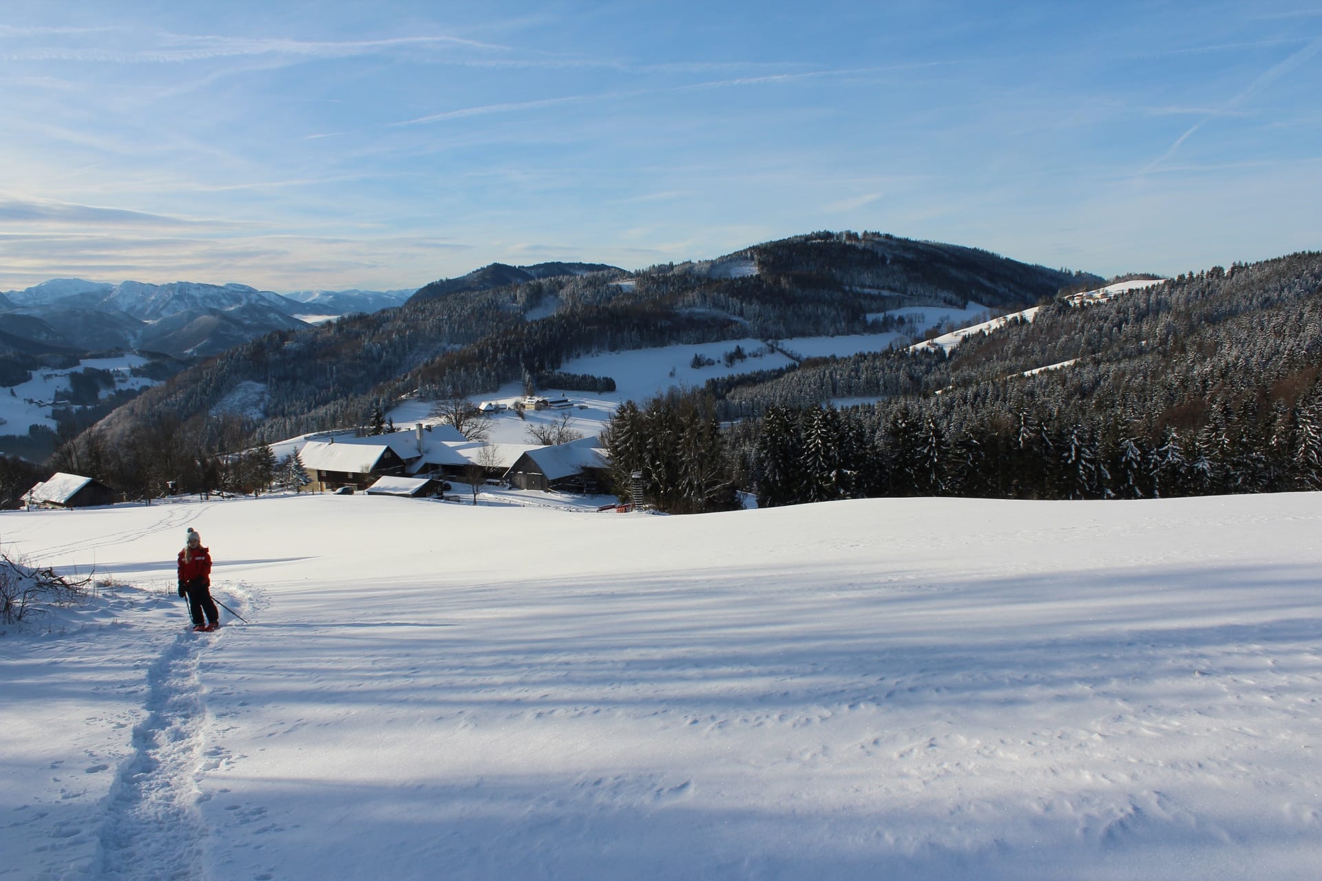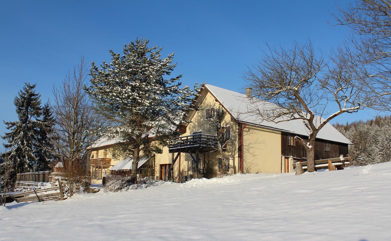 Der Hirmhof liegt in Einzellage umgeben von Wiesen und Wäldern auf ca. 800m Seehöhe am Südhang des Buchberges im Herzen des Mostviertels. Das herrliche Panorama bietet atemberaubende Blicke auf Ötscher, Dürrenstein und Gesäuse und lädt ein, die Seele so richtig baumeln zu lassen. Der Hirmhof ist der ideale Ausgangspunkt für schöne Spaziergänge, Wanderungen und Mountainbiketouren. Für unsere kleinen Gäste warten vor dem Haus ein gut überblickbarer Kinderspielplatz - mit Schaukeln, einer Sandkiste, einer Seilbahn und einem Aussichtsbaumstamm - auf große Abendteuer. Auf unserem Biobauernhof gibt es Rinder, Hühner, Hängebauchschweine und unsere kinderlieben Katzen, welche sich stets über Streicheleinheiten freuen. Für unsere Gäste stehen zwei großzügige, südseitig ausgerichtete Ferienwohnungen (teilweise mit Sauna) zur Verfügung. Seminargruppen nutzen gerne den geräumigen, holzvertäfelten Seminarraum, welcher mit seinem großen Panoramafenster und dem Kaminofen für eine einladende und inspirierende Atmosphäre sorgt. Ein romantischer Lagerfeuerplatz und Tischtennis runden das Angebot ab. Sowohl für Familien als auch für Gruppen bietet der Hirmhof mit seiner einzigartigen Lage ein wahres Naturparadies.