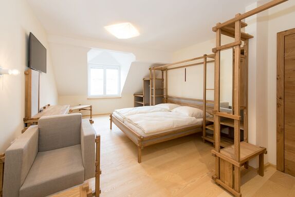Gemütliche, helle Zimmer mit Möbeln aus Eichenholz (nur verleimt oder zusammengesteckt – keine Verwendung von Metall), einem Eschenboden und Matratzen aus Naturkautschuk laden zum Entspannen und Fallenlassen ein.