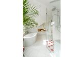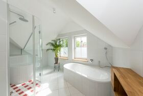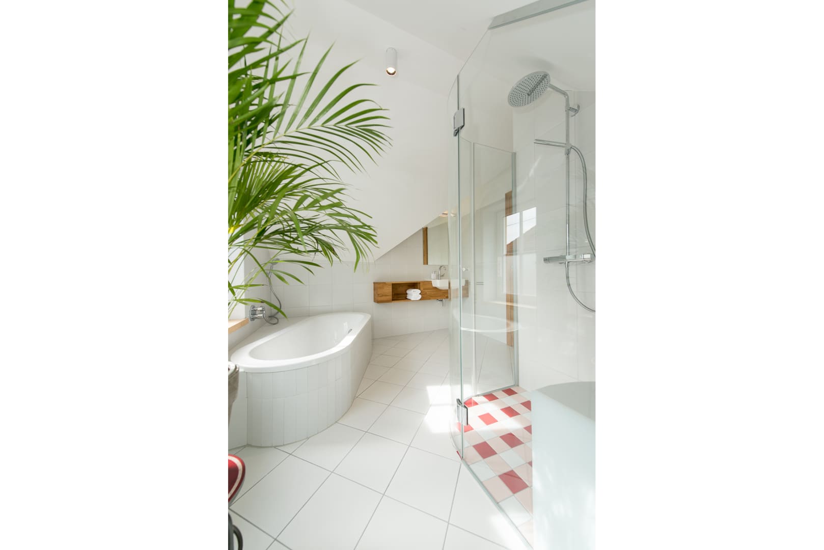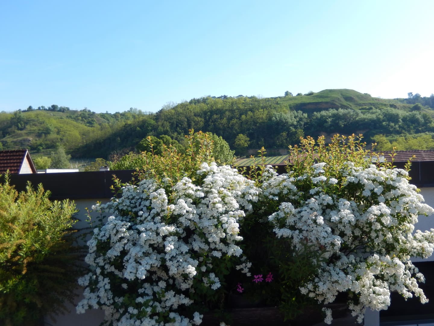 Unser drittes Zimmer mit dem Blick auf unseren Auberg – auf dessen Vorderseite waren früher felsige Weinberg-Terrassen; auf der Rückseite ist ein Mischwald, hauptsächlich mit Eichenbäumen; auf der Spitze erhebt sich ein Kreuz und ladet somit zu einer kleinen Wandertour ein - ist das etwas grösser Zimmer. Im Badzimmer befindet sich eine eigen Badewanne, in der Dusche sogar eine Sitzgelegenheit mit eingebauter Fußbodenheizung.