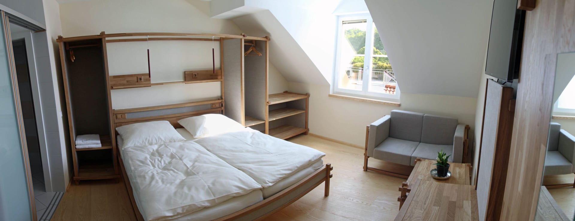 Unser erstes Zimmer mit dem Blick auf den Hausberg – ein Wahrzeichen von Grossriedenthal mit einer ausgedehnten Trockenrasenfläche – ist mit heimischen hellen Naturholz ausgestattet. Die handgefertigte Couchbank bietet ein tolles Sitzerlebnis und auf dem 210x180 cm großen Bett mit Naturkautschukmatratzen kann man sich richtig erholen.