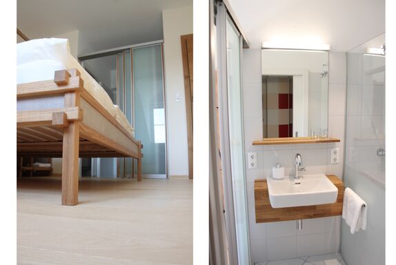 Gemütliche, helle Zimmer mit Möbeln aus Eichenholz (nur verleimt oder zusammengesteckt – keine Verwendung von Metall), einem Eschenboden und Matratzen aus Naturkautschuk laden zum Entspannen und Fallenlassen ein.