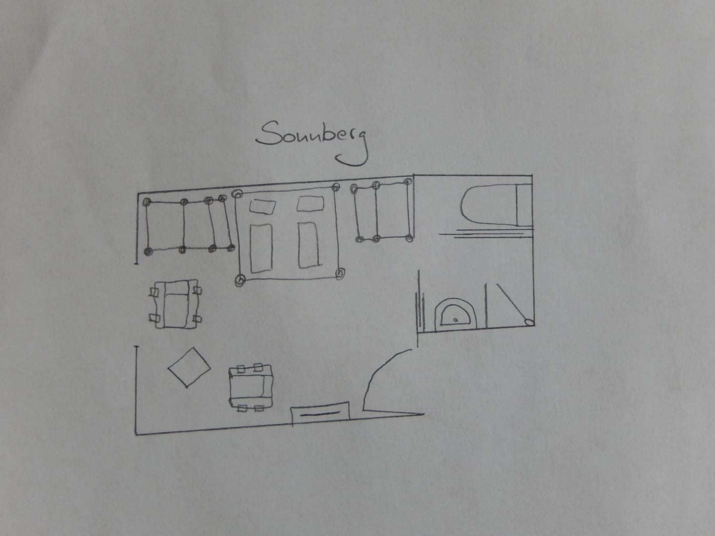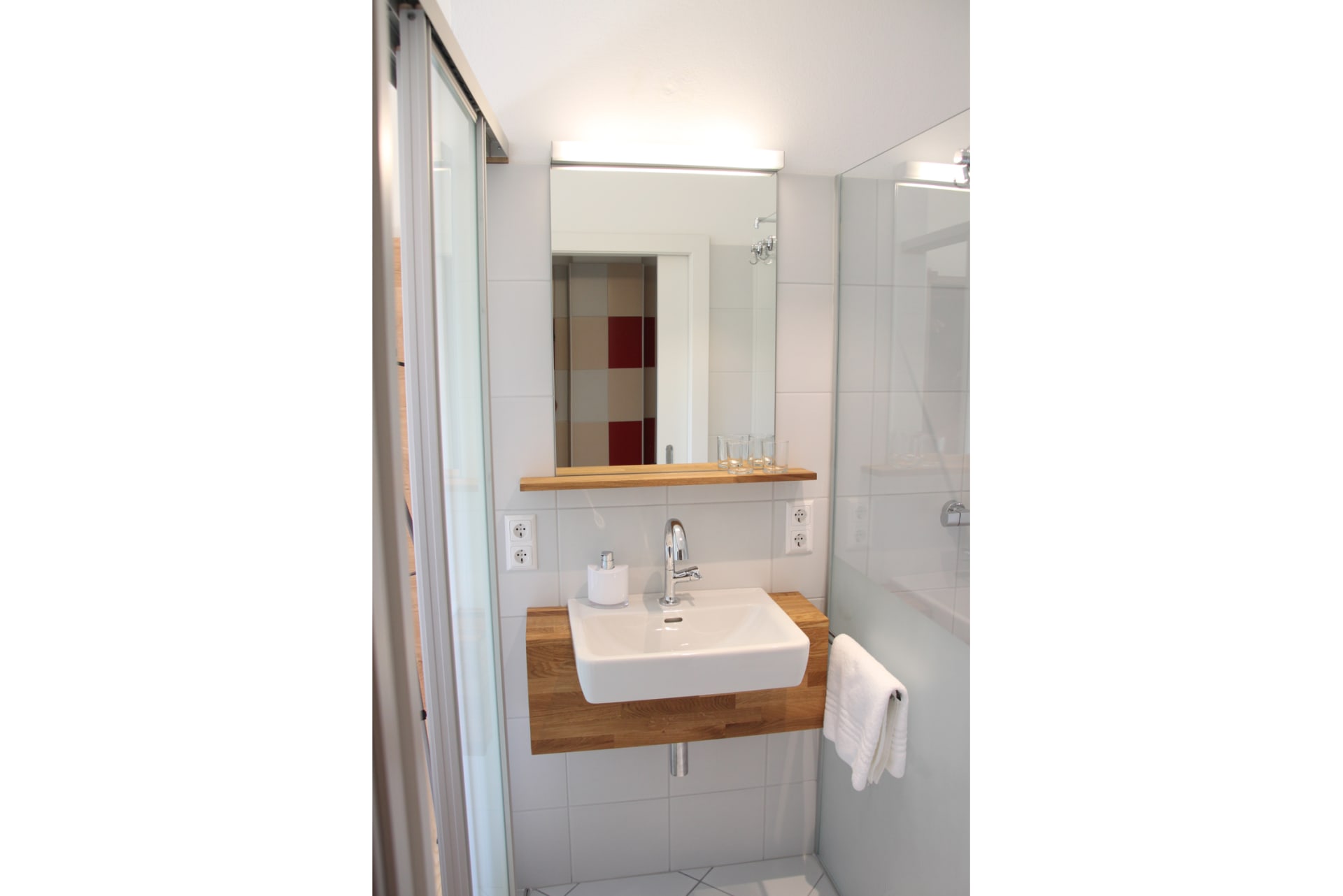 Unser zweites Zimmer mit dem Blick auf den Sonnberg – auf dessen Hochplateau unser frisch fruchtiger Grüner Veltliner namens „Juche“ wächst - ist auch mit heimischen hellen Naturholz ausgestattet. Der geflieste Boden in der Dusche und eine Wand im WC hat das Farbmuster eines Tischtuches von einem typischen Heurigentisch in rot-weiß-rosa gehalten.
