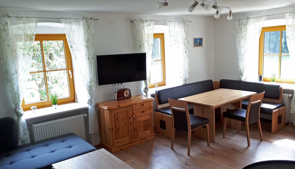 Sat- TV 32 Zoll mit Internetfernsehen, Radio, Gratis WLAN, eigener Parkplatz, Fahrrad / Ski Abstellraum, Holzhütte mit Brennholz, Terrasse im Hof mit Gartenganitur und Liegen