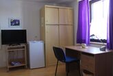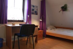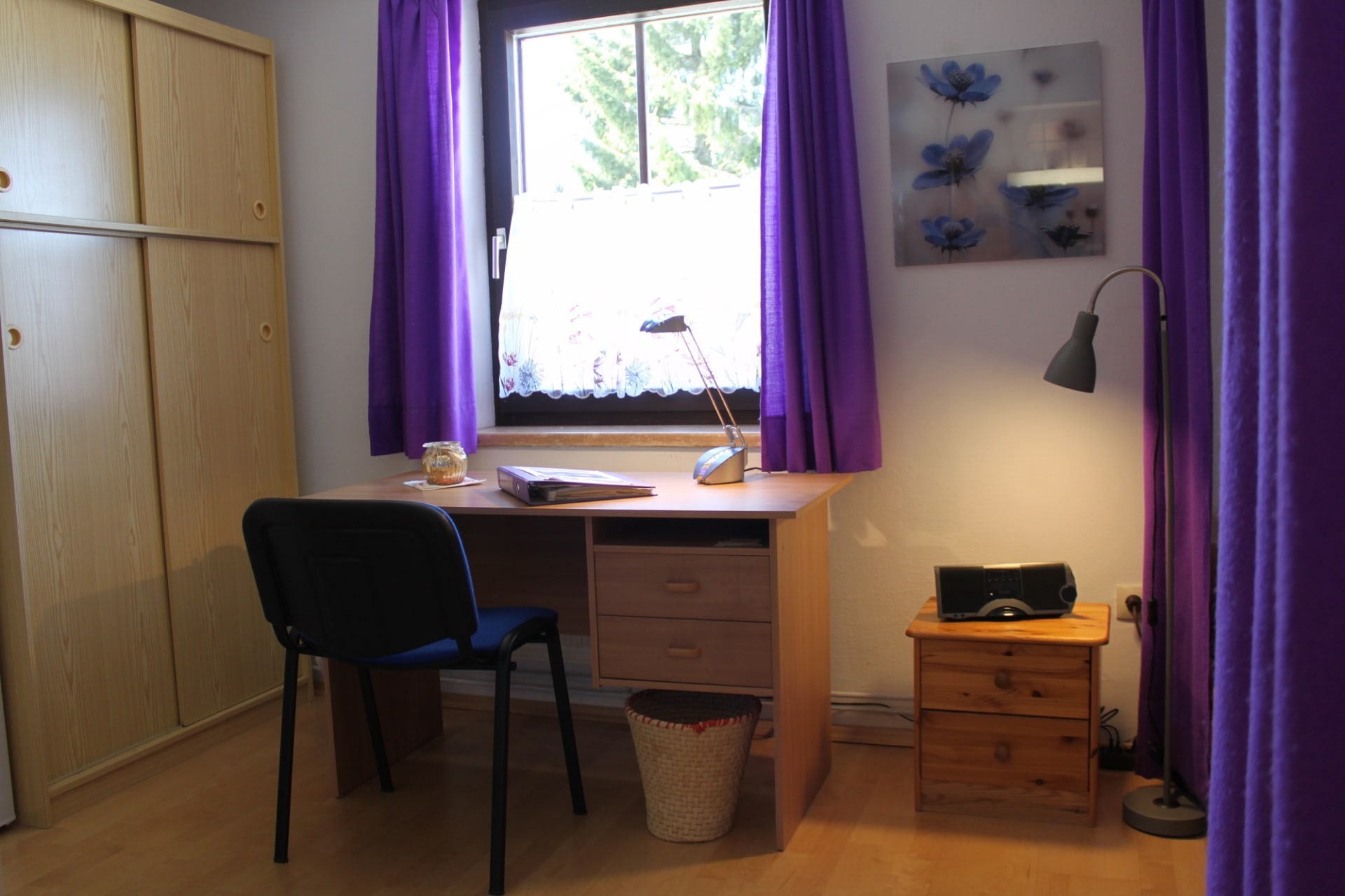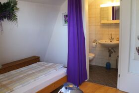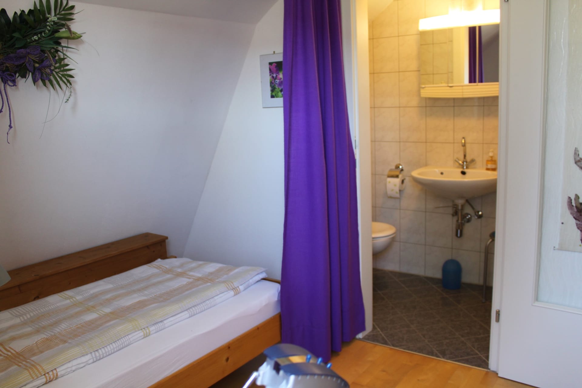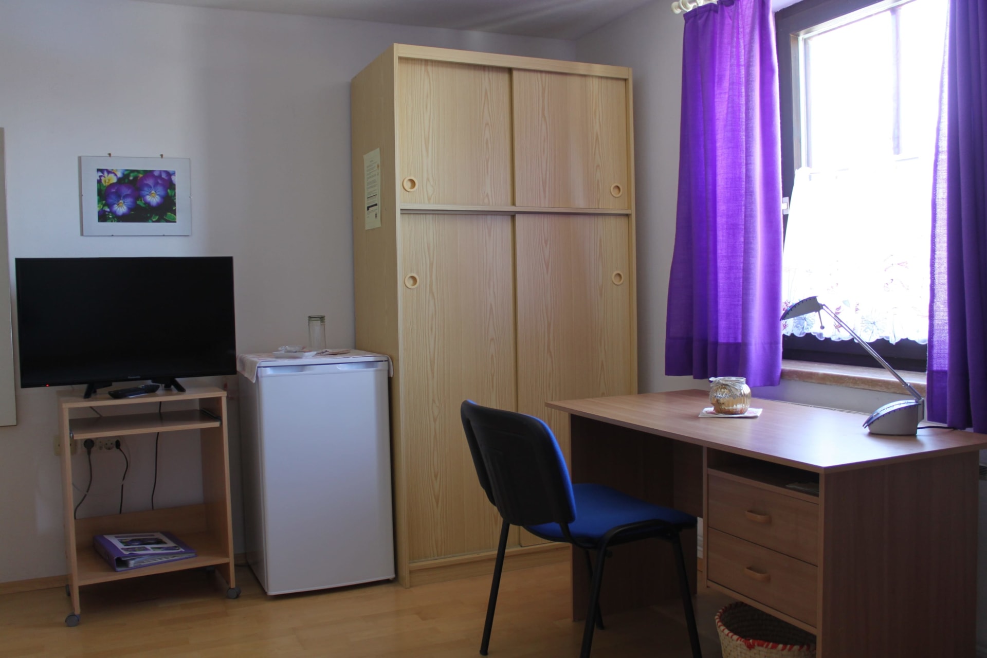 Veilchenzimmer (16m²) mit Tisch, Bett, Kasten und eigene DU/WC