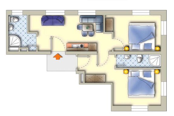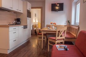 Liebevoll eingerichtetes Apartment im Erdgeschoß mit 2 Doppelzimmern jeweils mit Dusche/WC, Wohnküche mit Essplatz, Flat-TV, Schlafsofa für eine weitere Person, Ceranfeldern, Mikrowelle mit Grill- und Backfunktion, Geschirrspüler, Kaffeemaschine und Wasserkocher. Größe ca. 50 m². Hinweis: Bei Buchung von 3 Personen steht Ihnen nur ein Doppelzimmer mit Dusche/WC zur Verfügung.