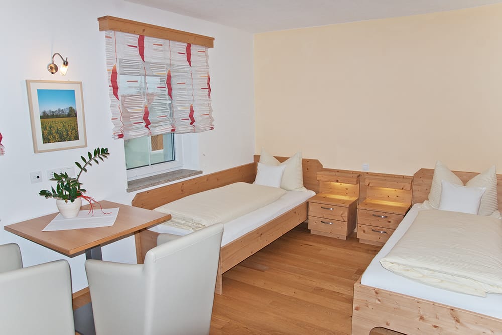 Zweibettzimmer mit getrennt gestellten Betten, Dusche/WC und Kochnische.