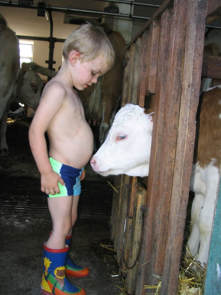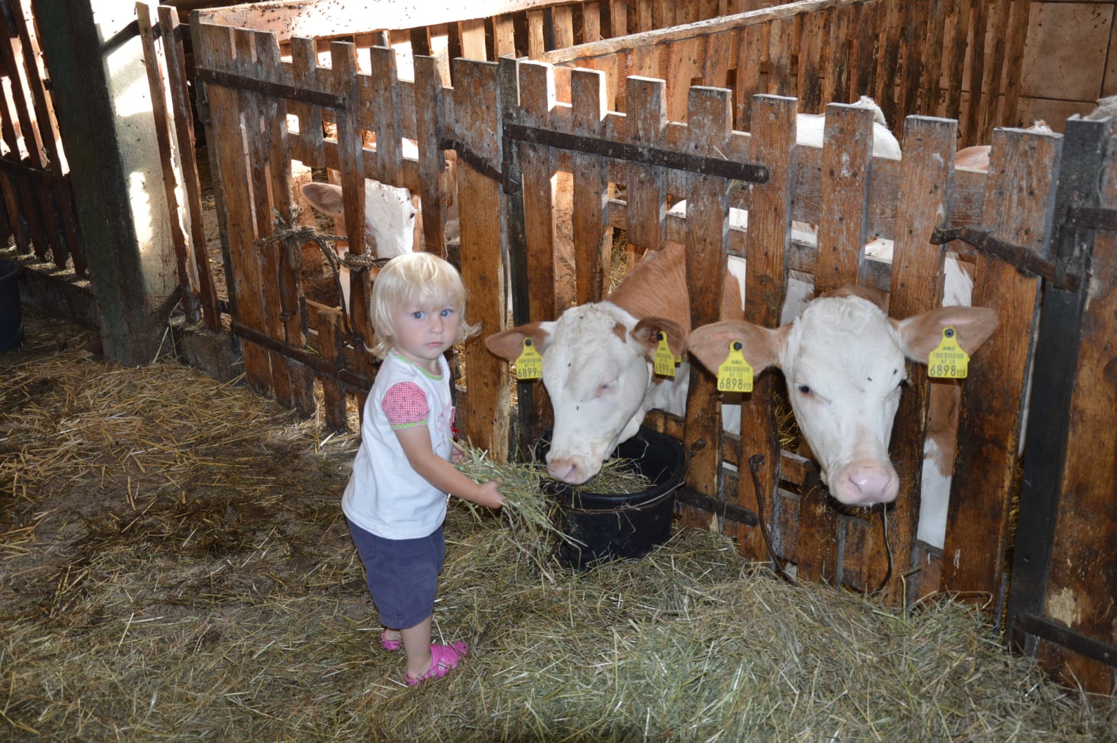 Für unsere Gästekinder ist es ein besonderes Erlebnis, die Kühe auf der Weide zu sehen, abends beim Melken im Stall dabei zu sein, die kleinen vierbeinigen Tiere zu streicheln, zu füttern und mit ihnen zu spielen.