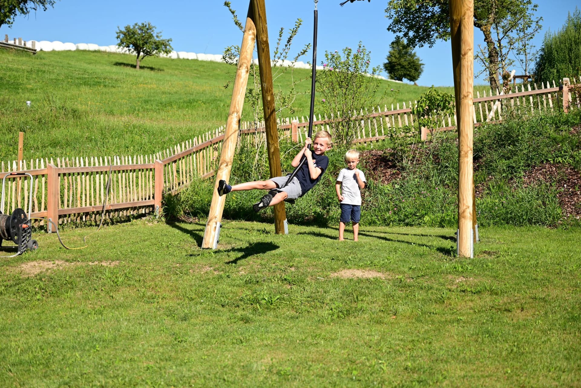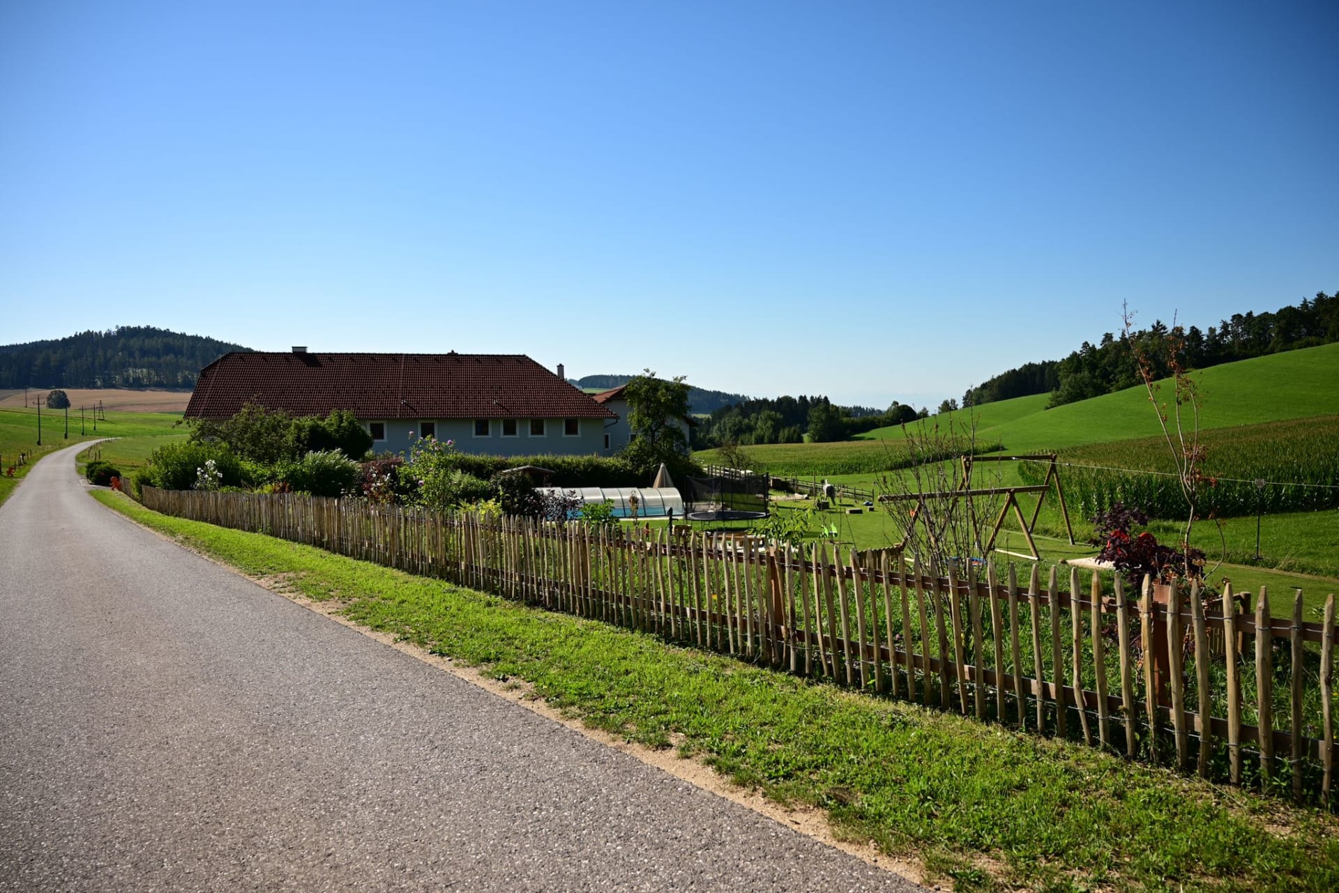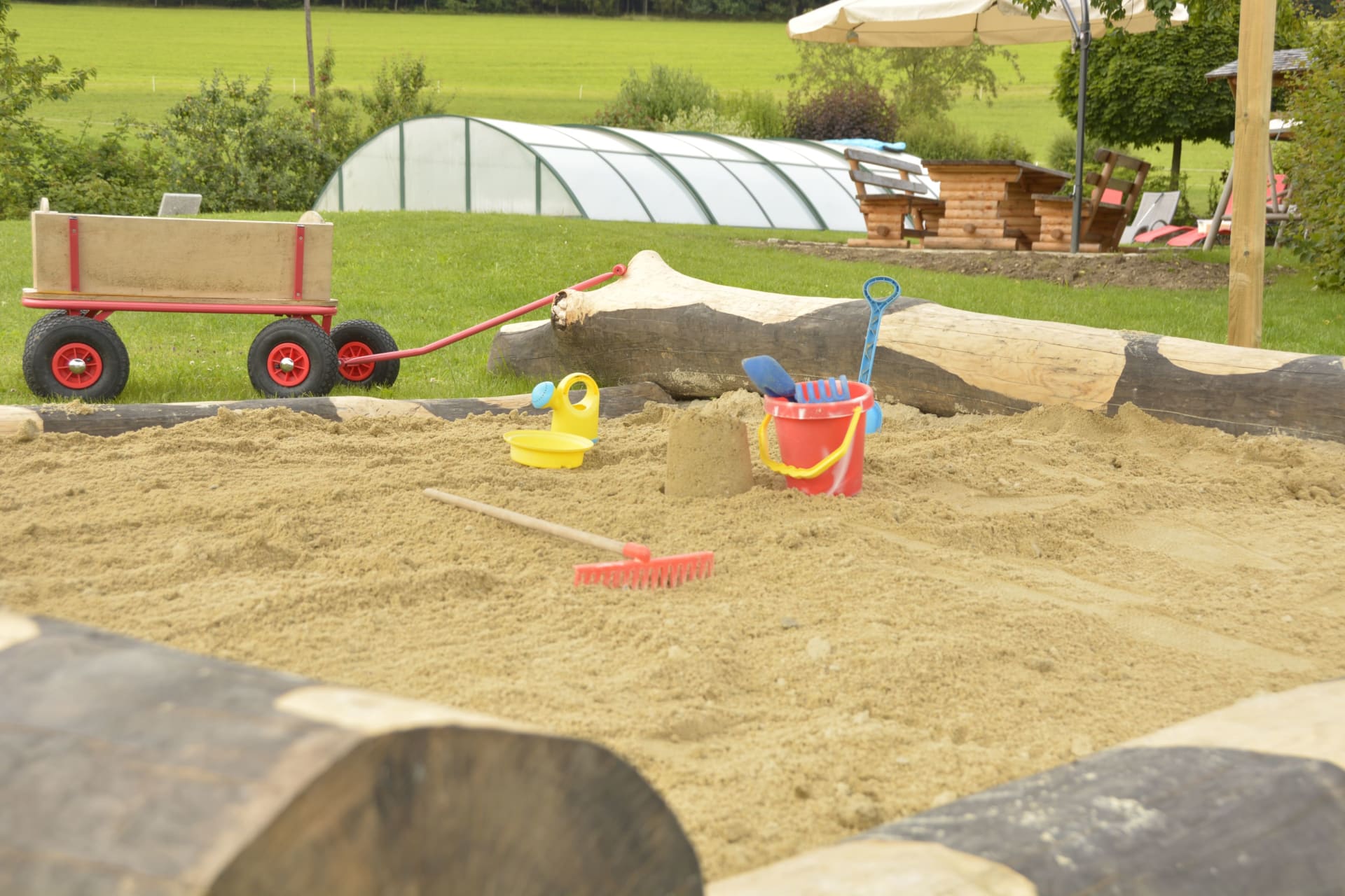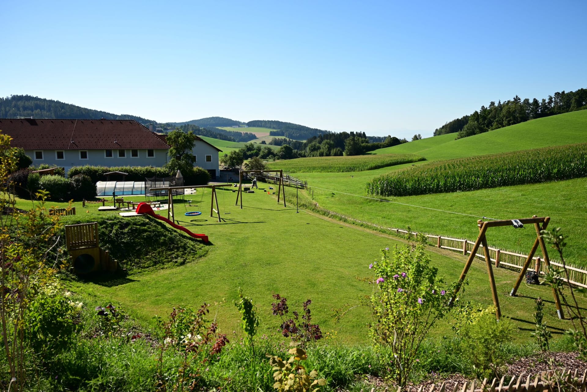 Ruhe, Auszeit und Entspannung - das finden unsere Gäste im großzügigen und gemütlich gestalteten Garten mit überdachtem Pool - ein richtiger Wohlfühlbereich! Für unsere kleinen Gäste stehen dort auch Spielgeräte wie beispielsweise ein Trampolin uvm. zur Verfügung. Spaziergänge in die nahegelegenen Wälder bieten ebenfalls die Möglichkeit, den Alltag hinter sich zu lassen und nur den sanften Klängen der Natur zu lauschen.