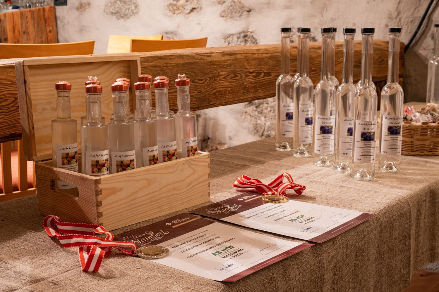 Auf unserem Bauernhof wartet gerne eine Schapsverkostung oder der Verkauf unserer Edelbrände auf Sie.