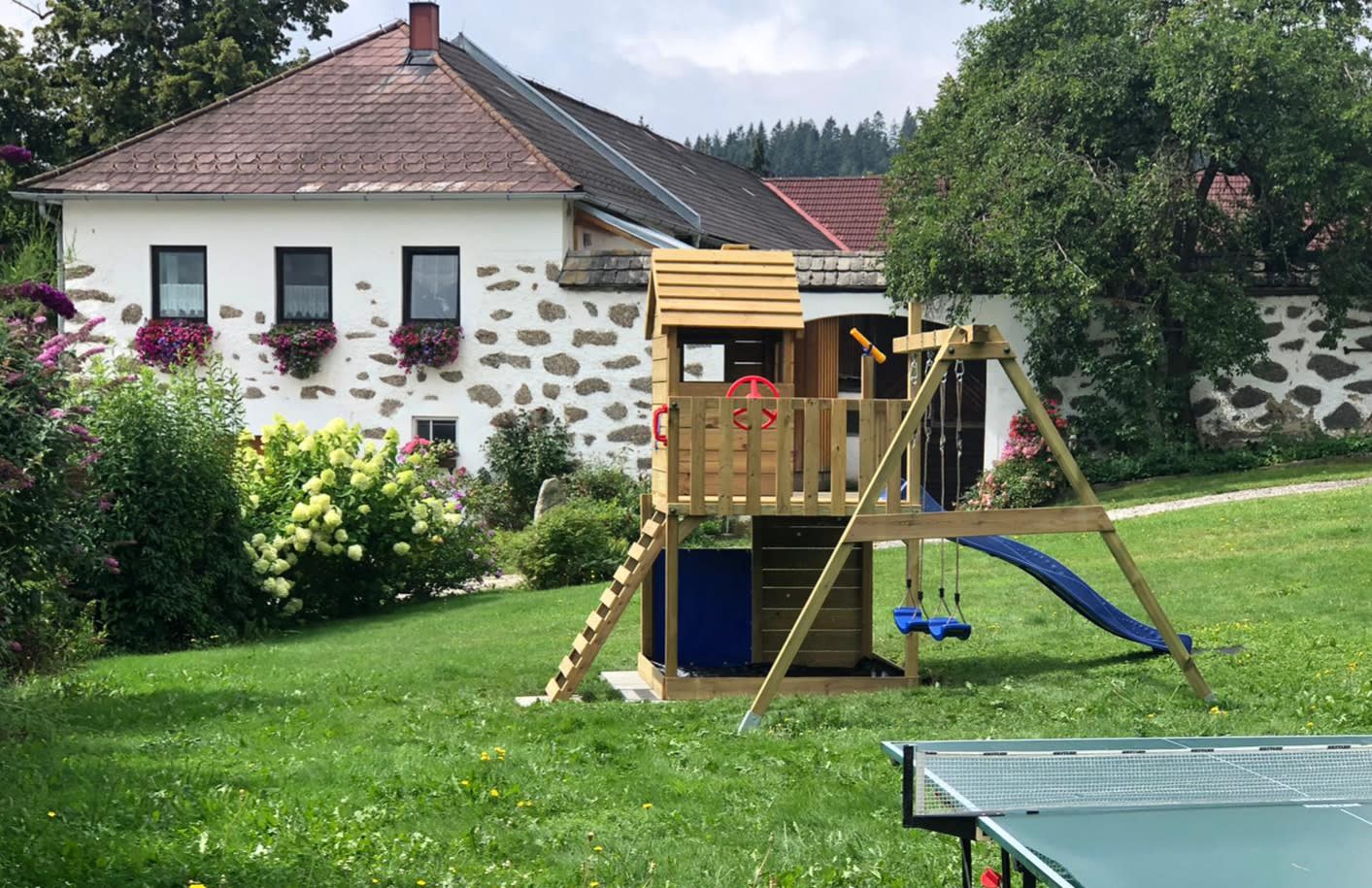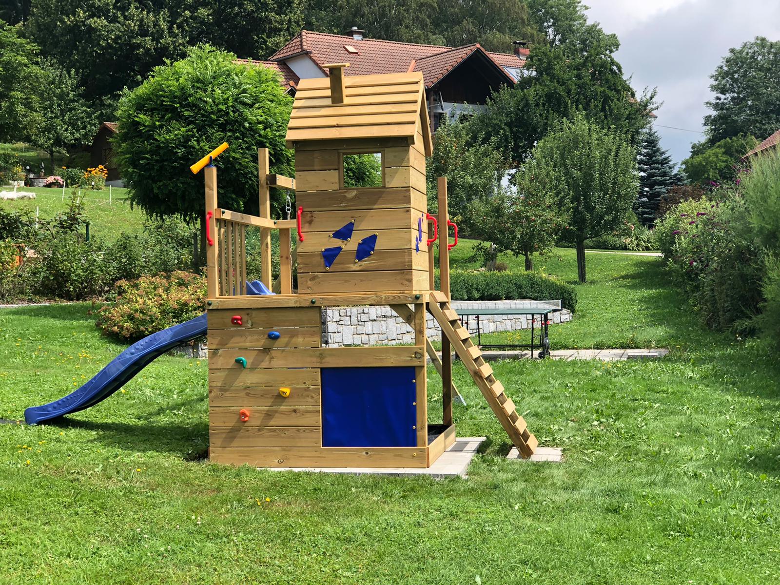 Für unsere kleinen Gäste steht ein Kletterturm mit Schaukel, Rutsche und Sandkasten bereit. Natürlich gibt es auch das passende Spielzeug dazu.