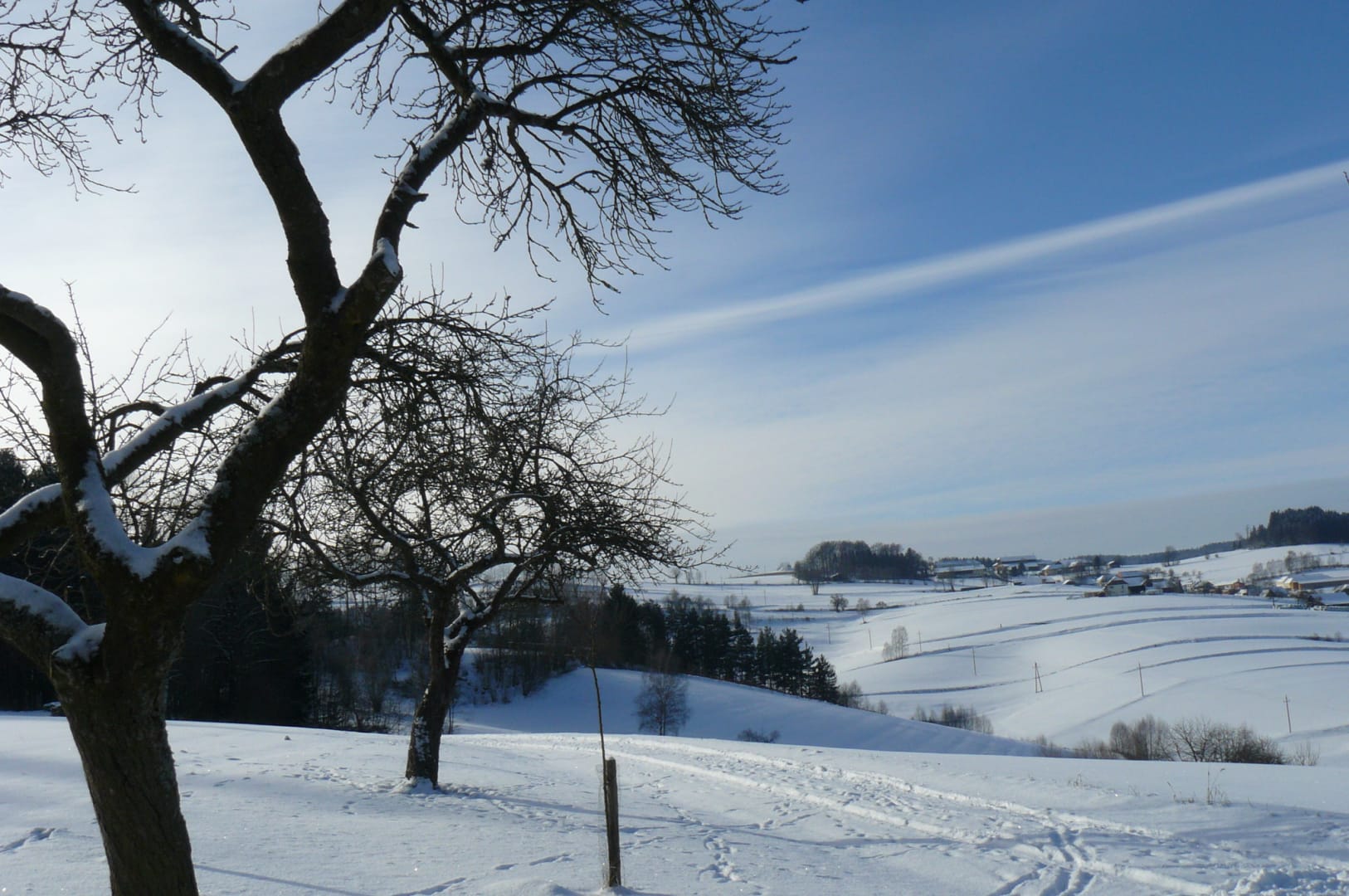 Von unserem Bergbauernhof Lias am Berg haben Sie einen wunderschöne Aussicht über die hügelige, verschneite Landschaft des Mühlviertels.