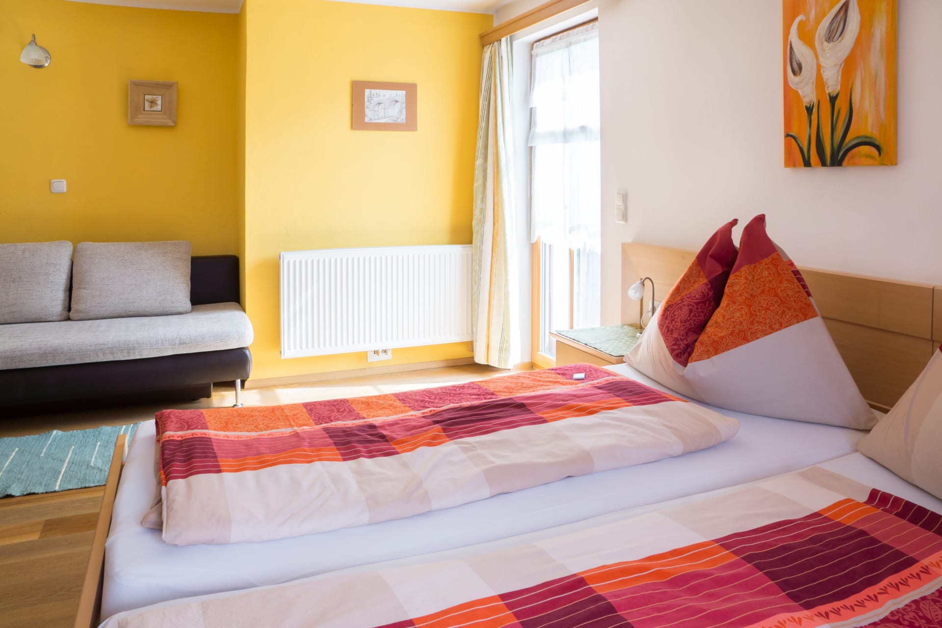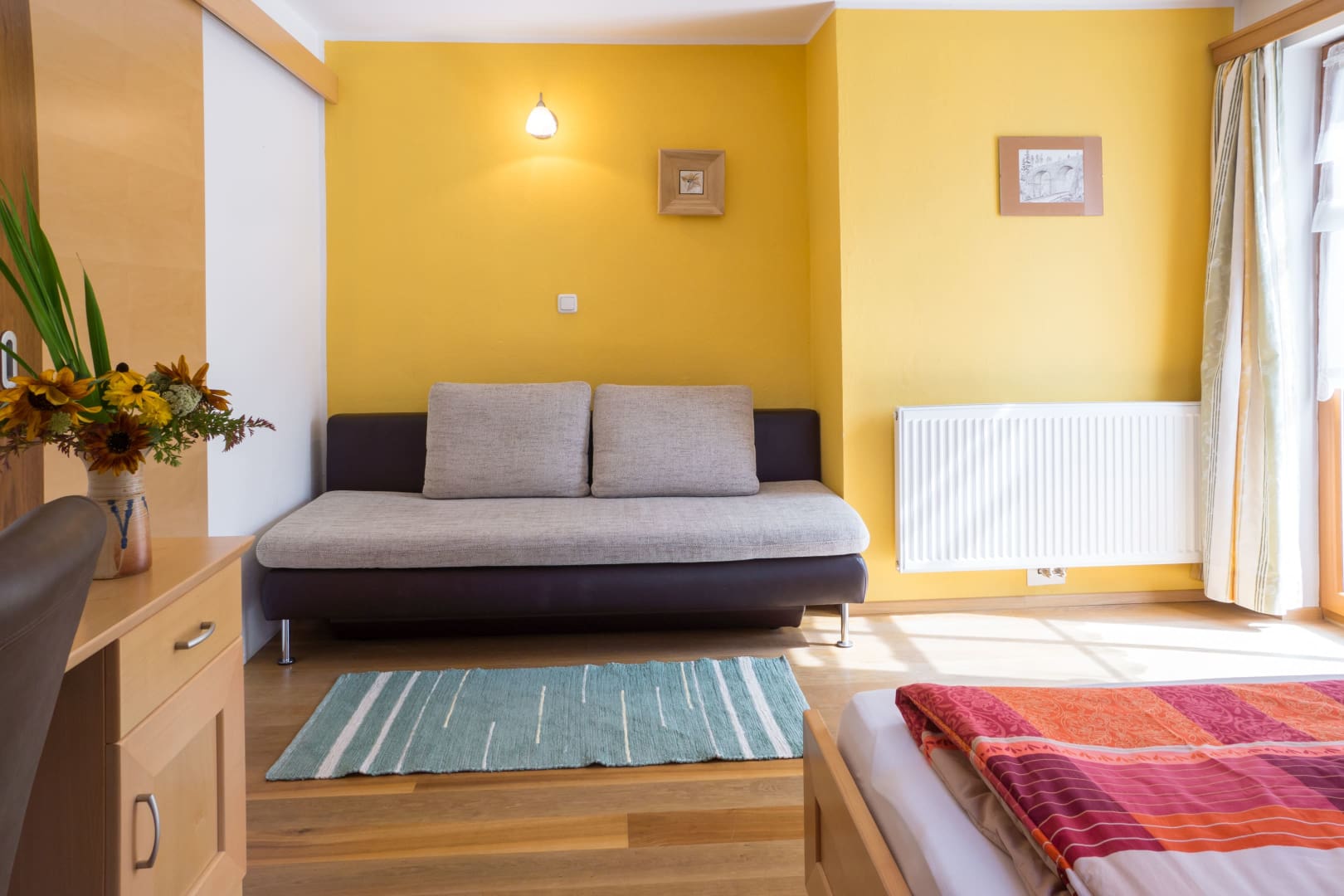 • Komfortzimmer Morgensonne ebenfalls mit Terrasse und Abgang in den Garten, Couch, Bad/WC, Sat-TV, Radio, Internetanschluss.
