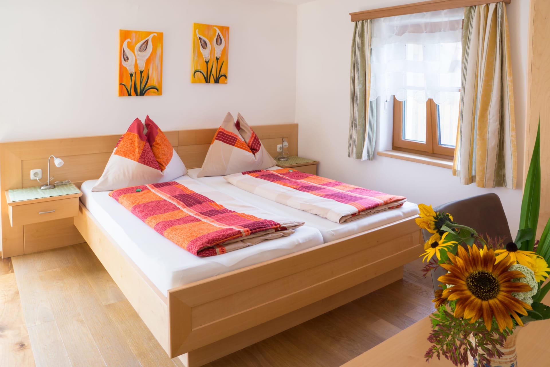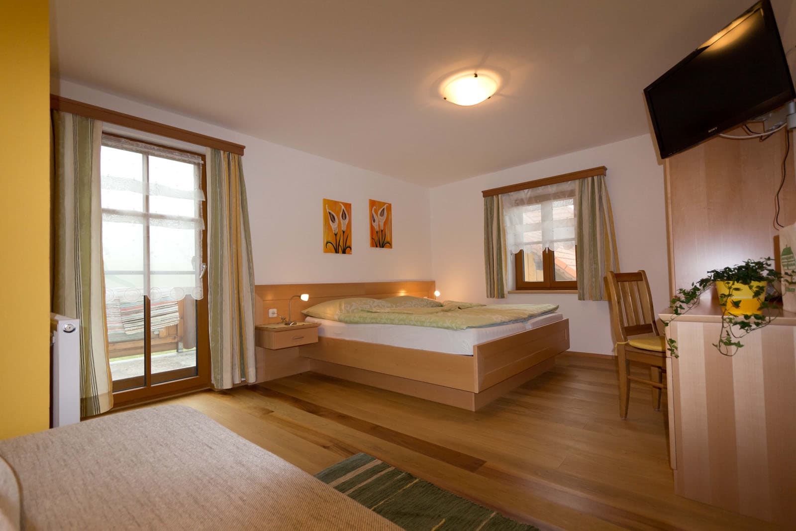Das gemütlich eingerichtete Doppelzimmer ist mit hochwertigen Vollholzmöbeln (Doppelbett, Schreibtisch, geräumigem Schrank), Dusche und WC getrennt, geölten Fußböden, Fliegengitter, Rollläden, Sat-TV, Radio, WLAN ausgestattet. Das Zimmer verfügt über eine große Terrasse mit Abgang in den Garten,